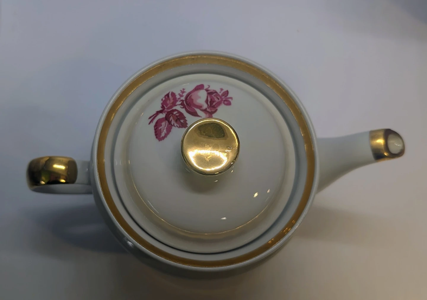 Very pretty teapot available in USSR 1960-1980s. In original condition, no chips or staining. Gold is hand painted, so there is some gold dripeed on the spout by the artisan that decorated this piece.