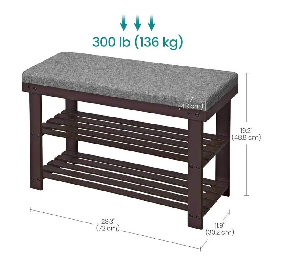 Compact and stylish bamboo shoe bench with a comfortable seat and 2-tier shoe storage. Perfect for an entryway, hallway, bedroom, or mudroom. Natural bamboo with brown and gray tones fits easily into modern and classic interiors.