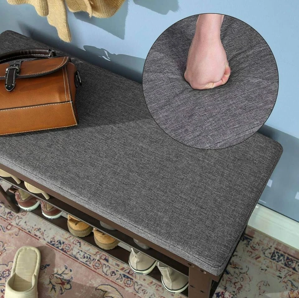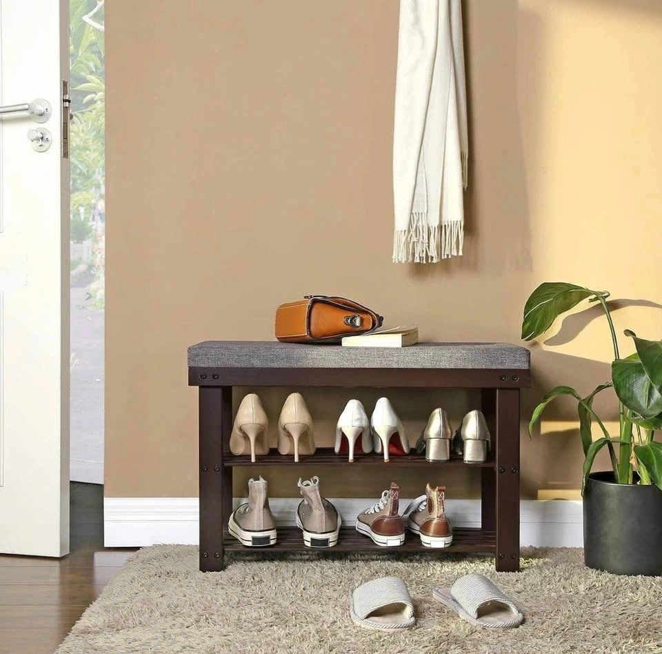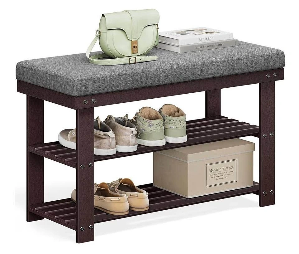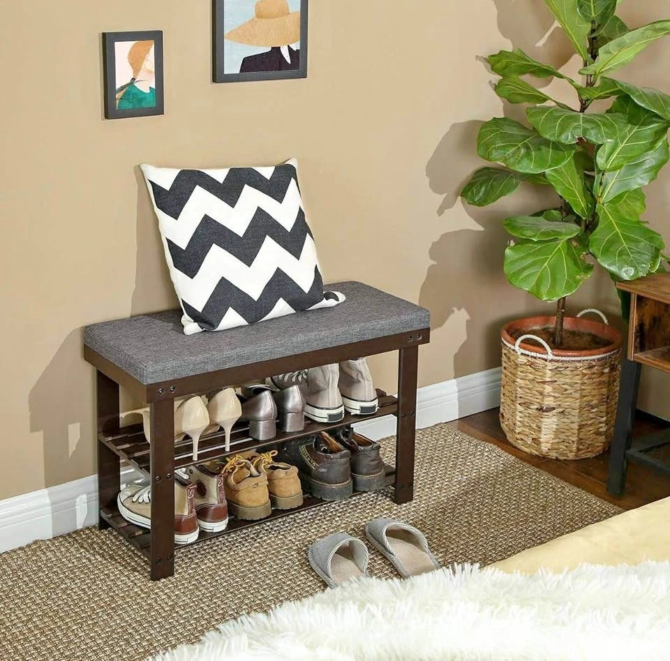 Compact and stylish bamboo shoe bench with a comfortable seat and 2-tier shoe storage. Perfect for an entryway, hallway, bedroom, or mudroom. Natural bamboo with brown and gray tones fits easily into modern and classic interiors.
