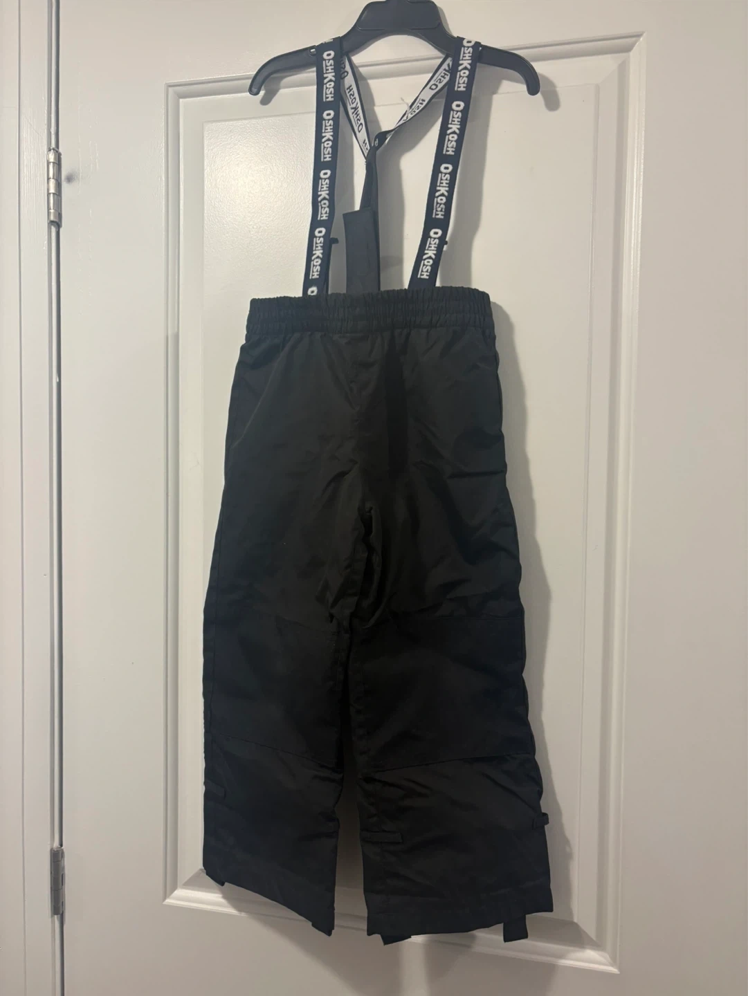 4T Black snow pants from OshKosh B'gosh. Features adjustable suspenders and elastic waistband. Water-resistant material.