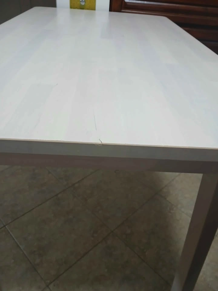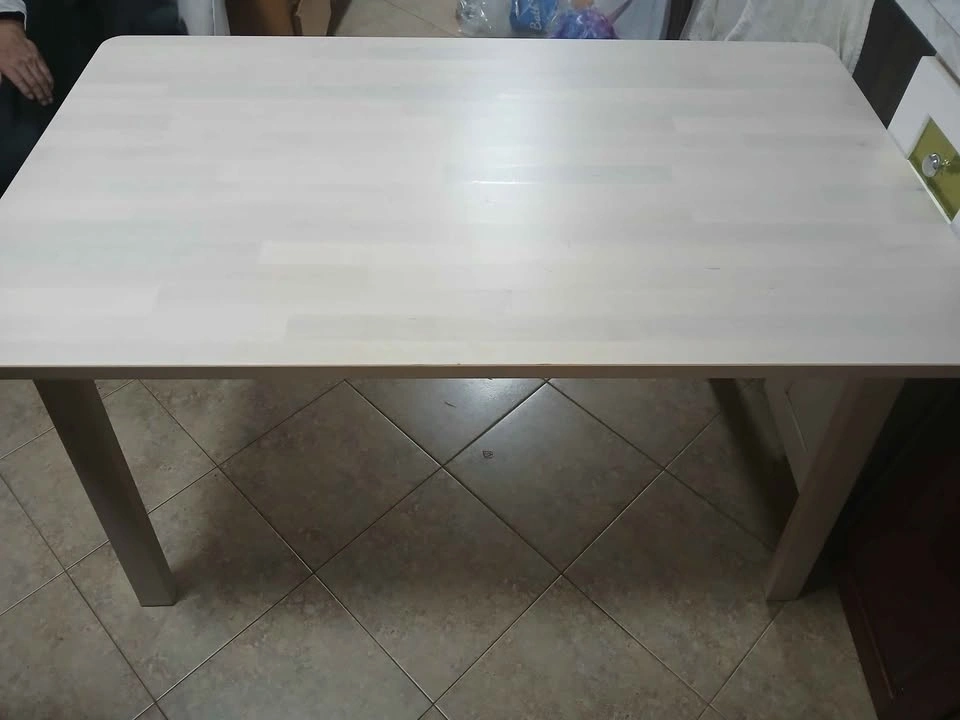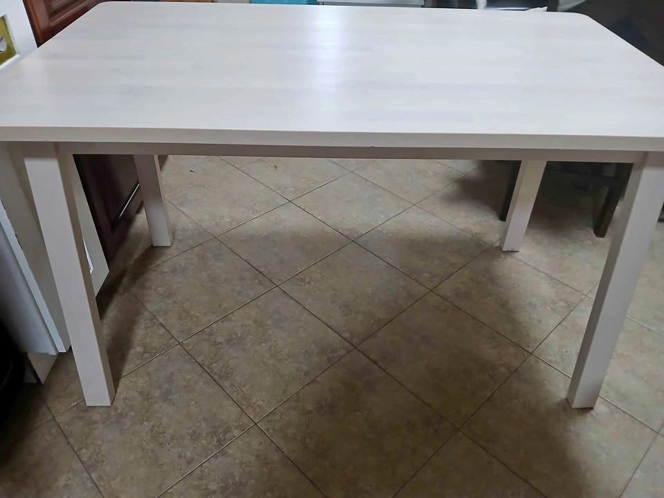 This white IKEA dining table is a practical and stylish addition to any dining area. Although it has some surface scratches, it remains a sturdy and stable piece of furniture, thanks to its four-legged design. The simple aesthetic ensures it will complement a variety of decor styles.