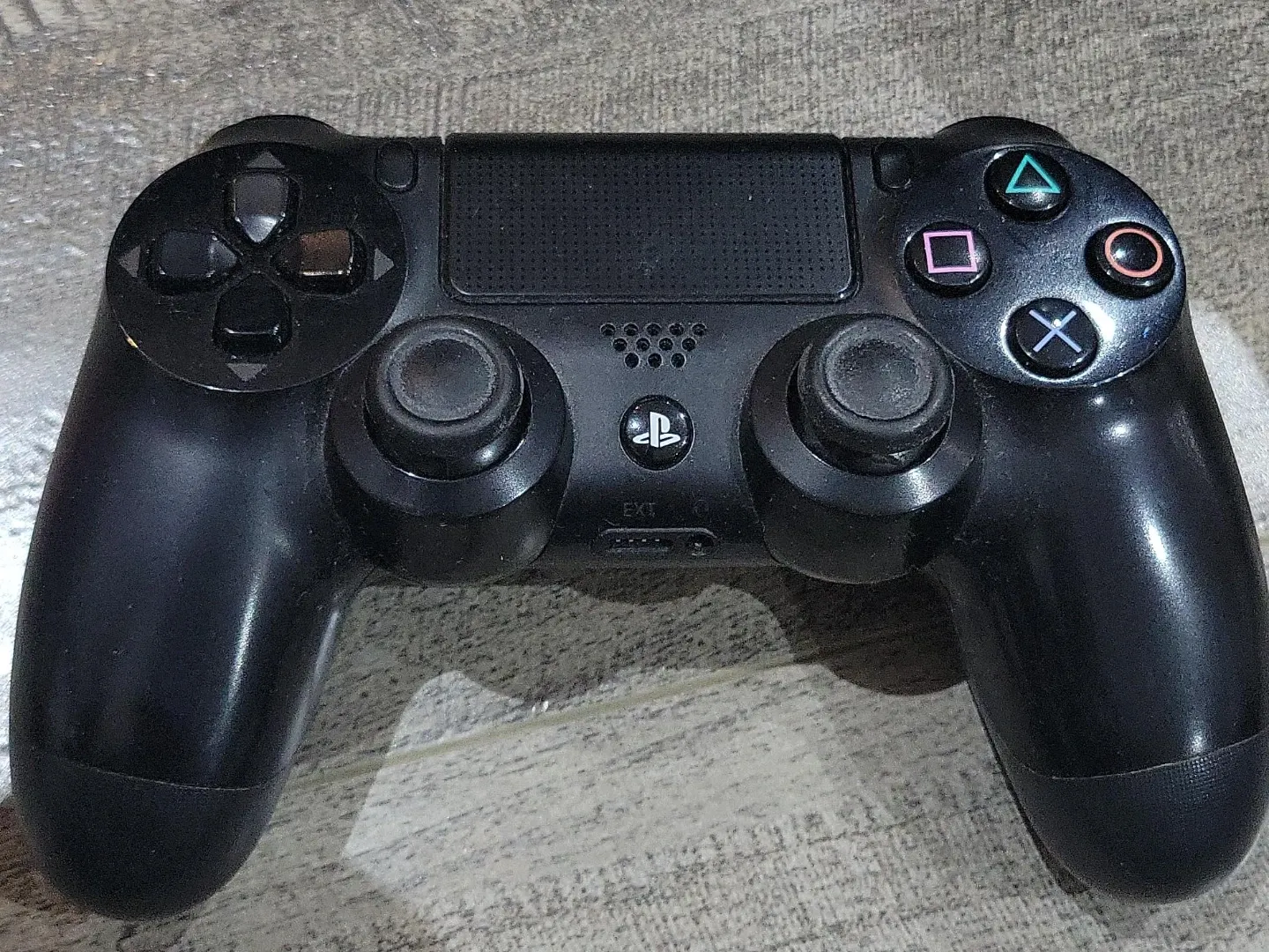 Black DualShock 4 wireless controller for PlayStation 4. It's a standard PS4 controller with all original buttons and joysticks. This controller is black plastic. It connects wirelessly.