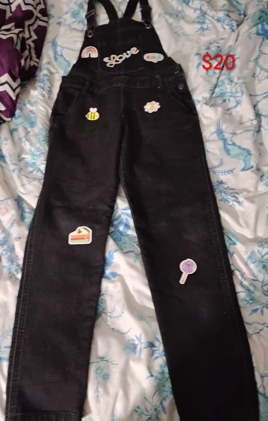 Black denim overalls embellished with fun patches including a rainbow, bee, cake, and lollipop. They're made of durable denim fabric. These overalls are great for adding a playful touch to any outfit! Size 14 Girls