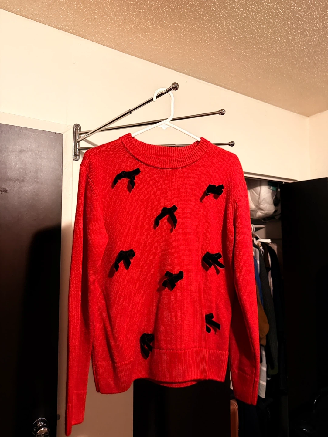 Red sweater with black bow accents