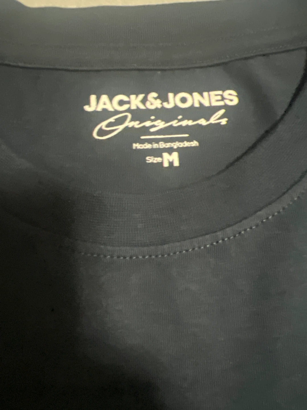 This is a navy blue Jack & Jones Originals t-shirt. It's a size medium. The shirt features a graphic print on the front.