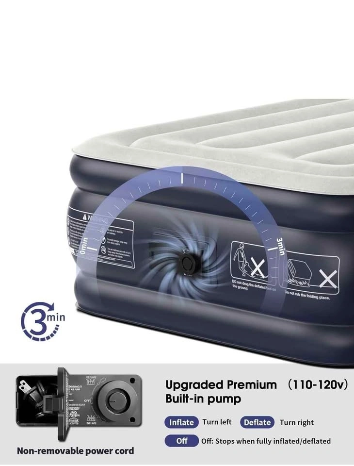 The double air mattress with built-in pump (110V) raised allows for fast and effortless inflation and deflation in just 3 minutes. Just plug in, turn the knob and it's ready to use or store, making it ideal for those who value efficiency. It deflates easily and folds compactly into a carry bag of only 14 pounds, making it the perfect companion for your on-the-go use.