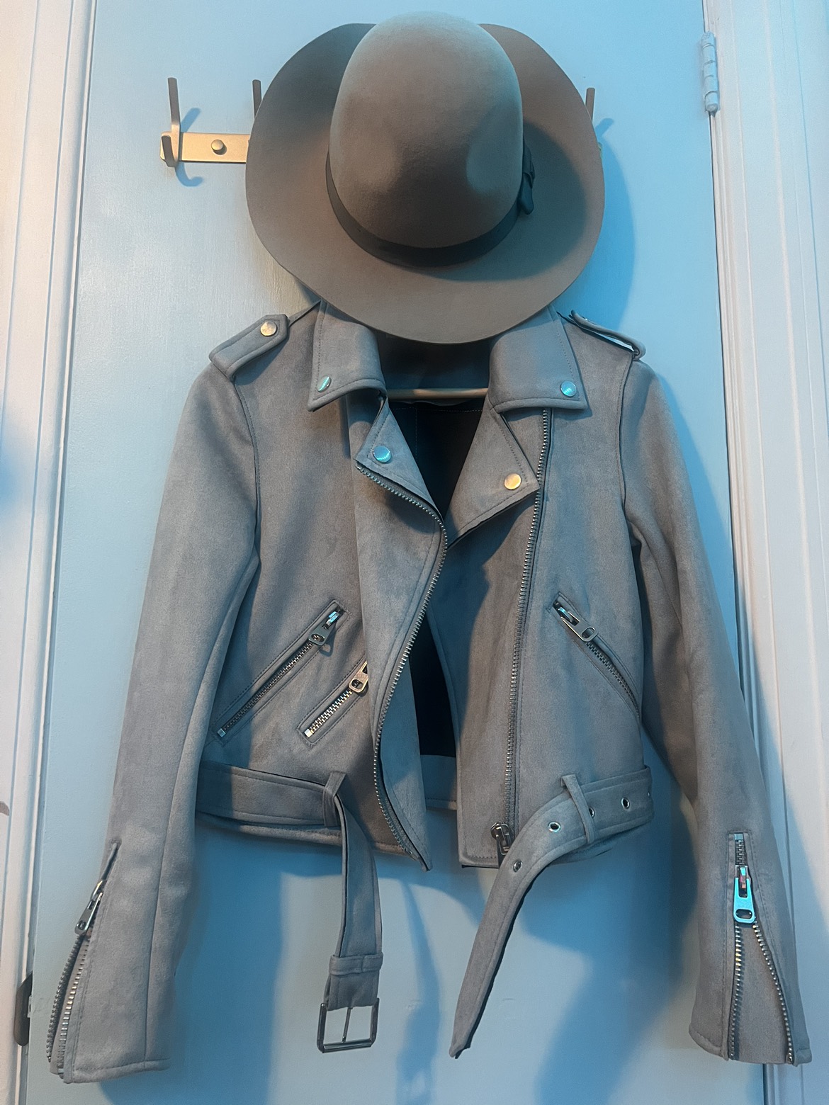 light blue faux suede texture moto style jacket