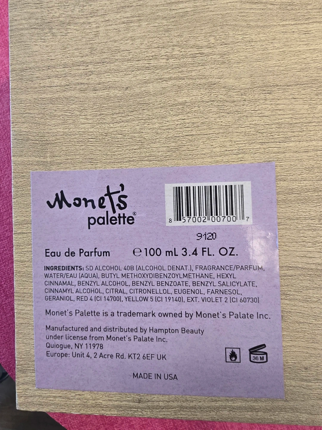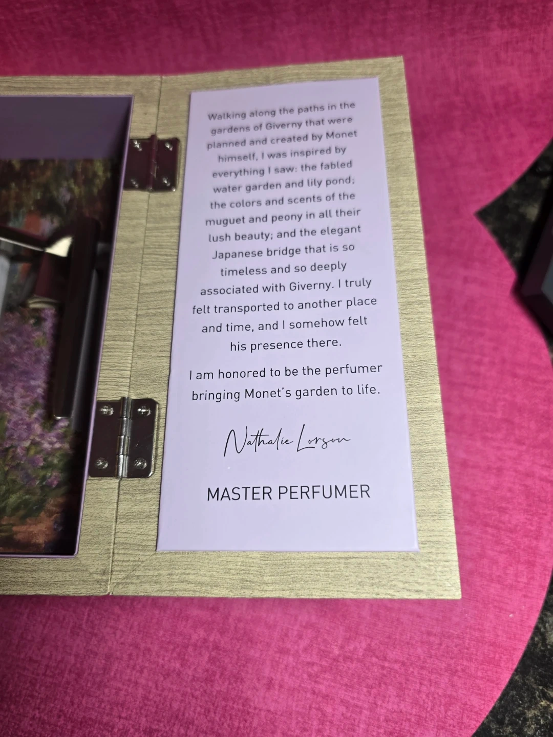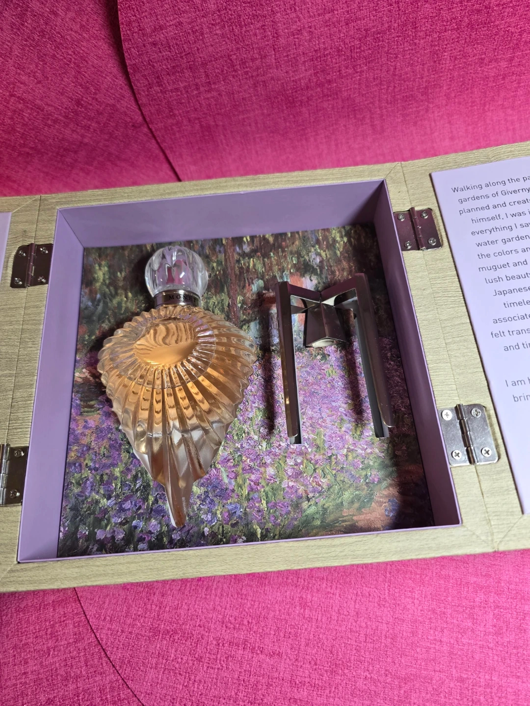 This set features a beautiful perfume inspired by Claude Monet's garden at Giverny. It's crafted by Master Perfumer Nathalie Lorson. The elegant bottle design and fragrant notes evoke the beauty of Monet's art and gardens.