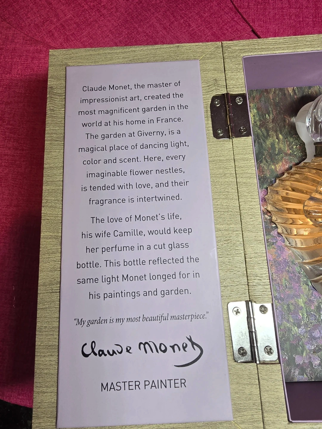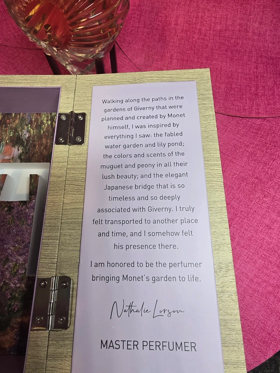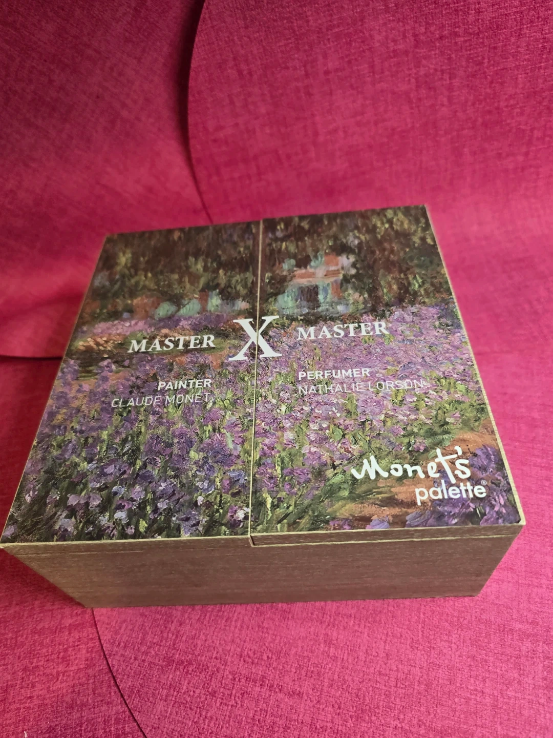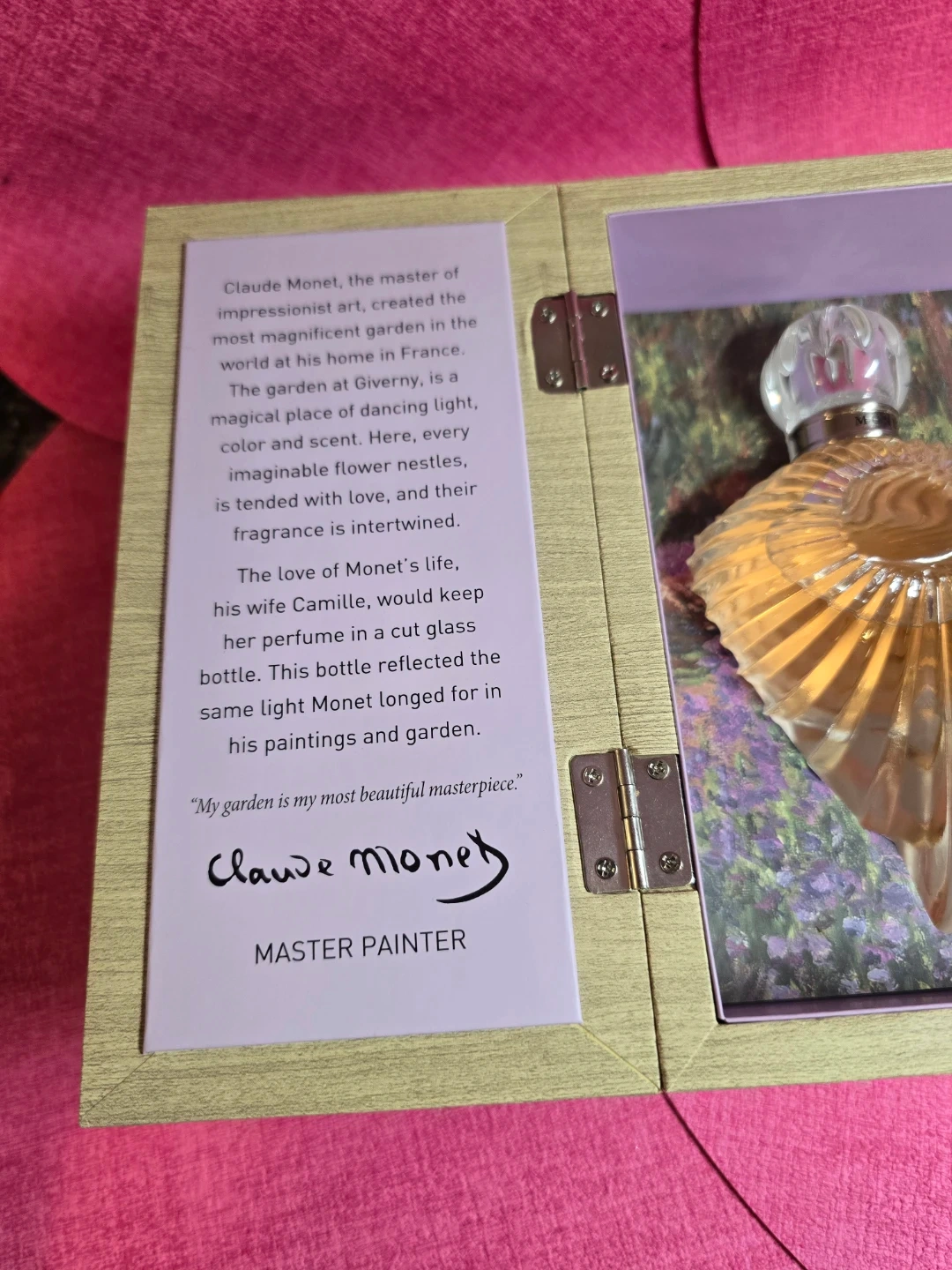 This set features a beautiful perfume inspired by Claude Monet's garden at Giverny. It's crafted by Master Perfumer Nathalie Lorson. The elegant bottle design and fragrant notes evoke the beauty of Monet's art and gardens.