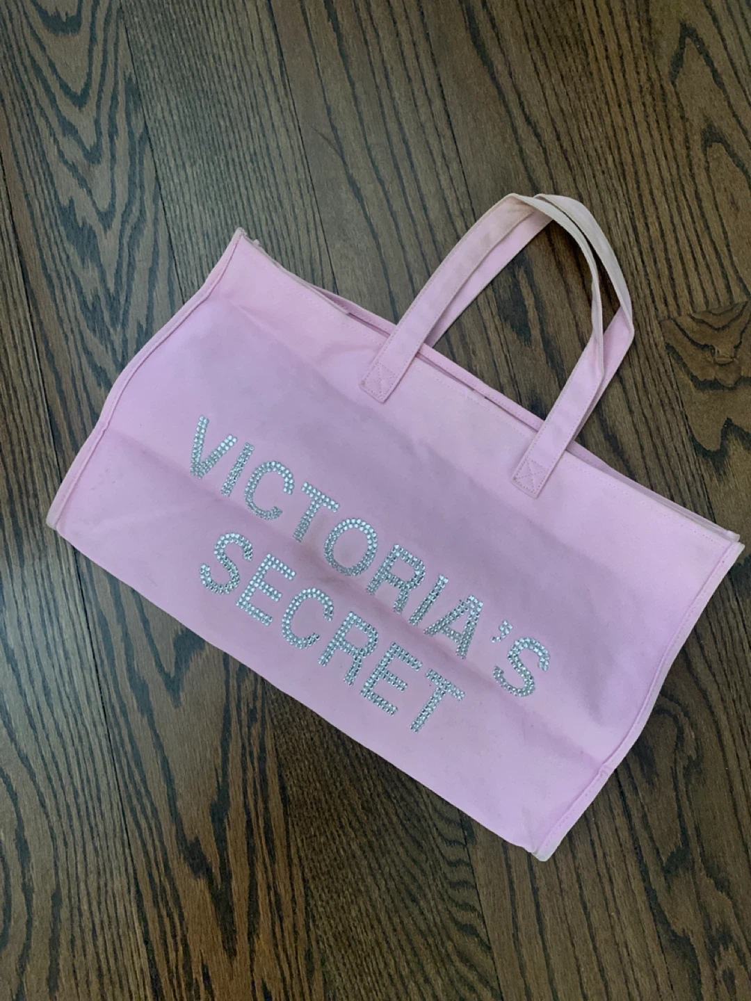 This is a pink tote bag from Victoria's Secret, embellished with sparkly rhinestones spelling out the brand name. It has two fabric handles for carrying. Perfect for beach days or everyday use!