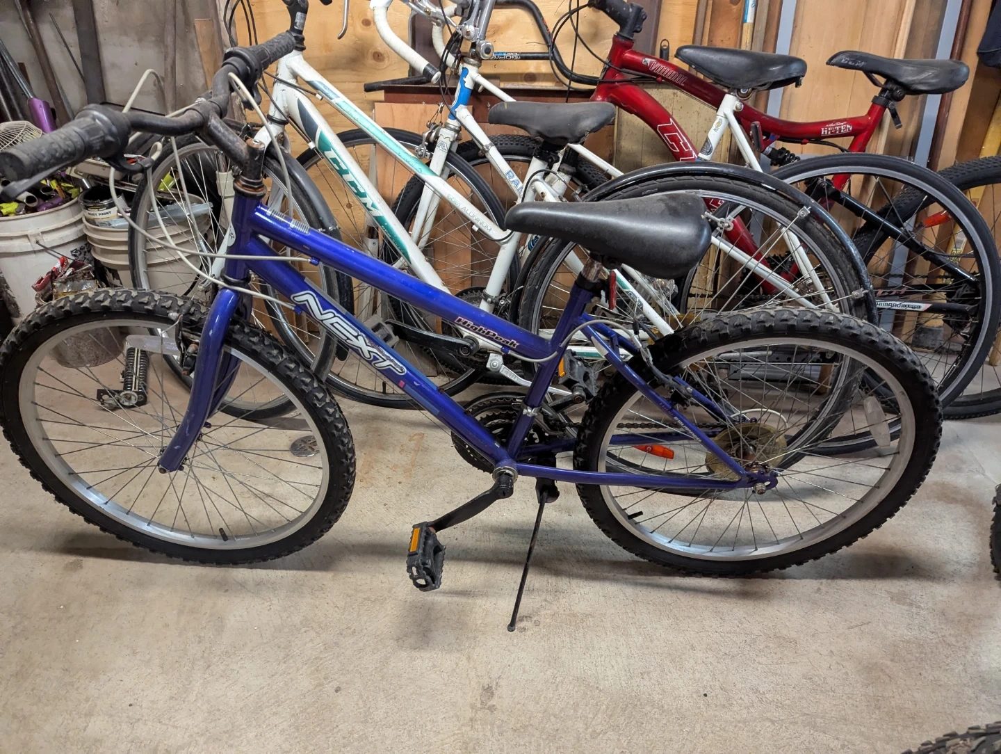 This is a blue Next HighPeak mountain bike. It features knobby tires for off-road riding. A kickstand is included.(Price is negotiable,need to get rid of soon)