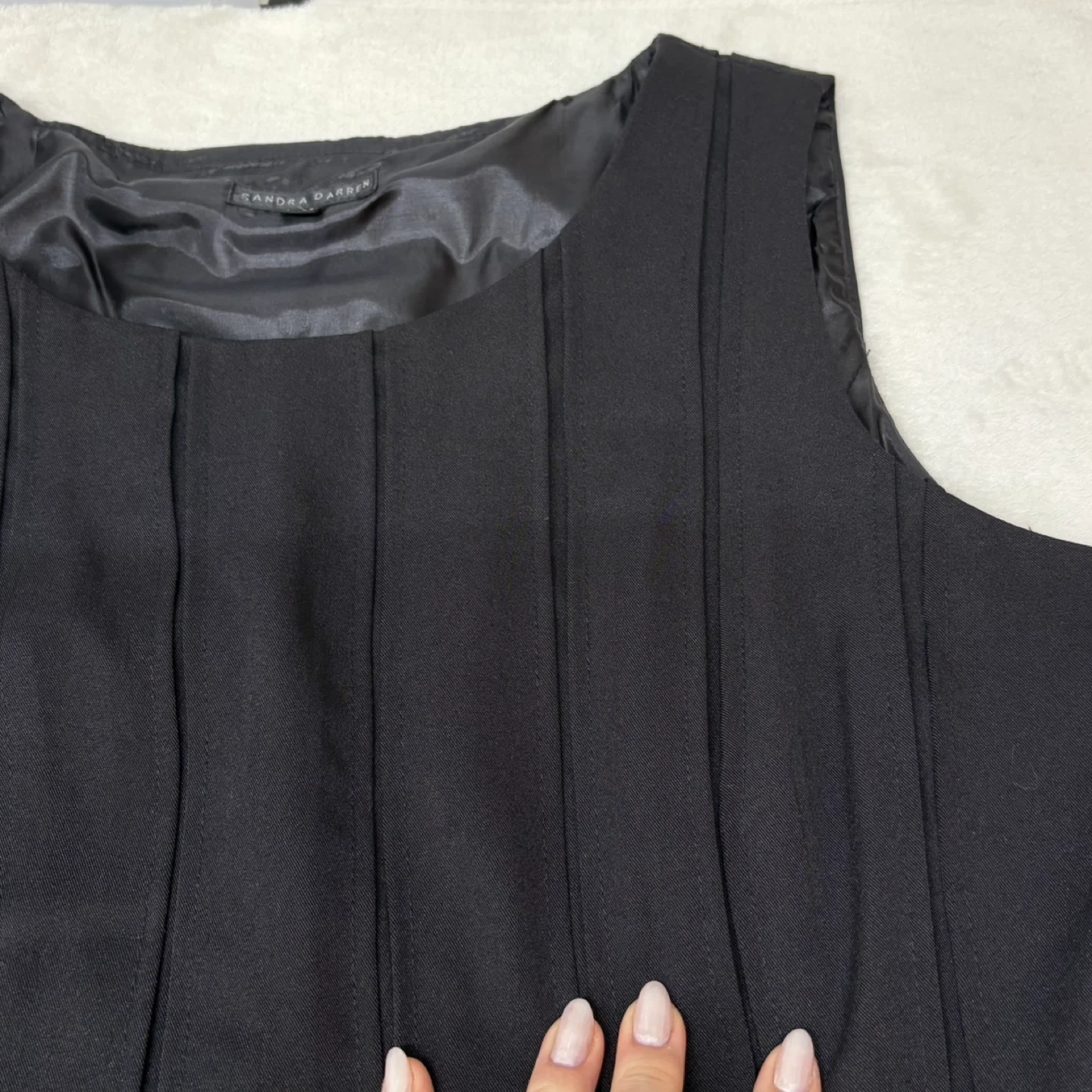 Elevate your wardrobe with this sophisticated Sandra Darren midi dress. This classic black piece features a flattering sleeveless silhouette and elegant vertical pleating that creates beautiful movement. Crafted with quality in mind, it is fully lined for comfort and a smooth fit, featuring a discreet invisible side zipper for a seamless look. Perfect for the office, cocktail parties, or any formal occasion.