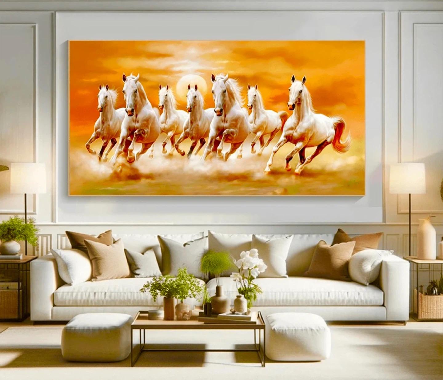 Beautiful canvas print featuring seven white horses galloping across a beach at sunset. It's a striking piece of art to liven up any room. This artwork is printed on high-quality canvas.