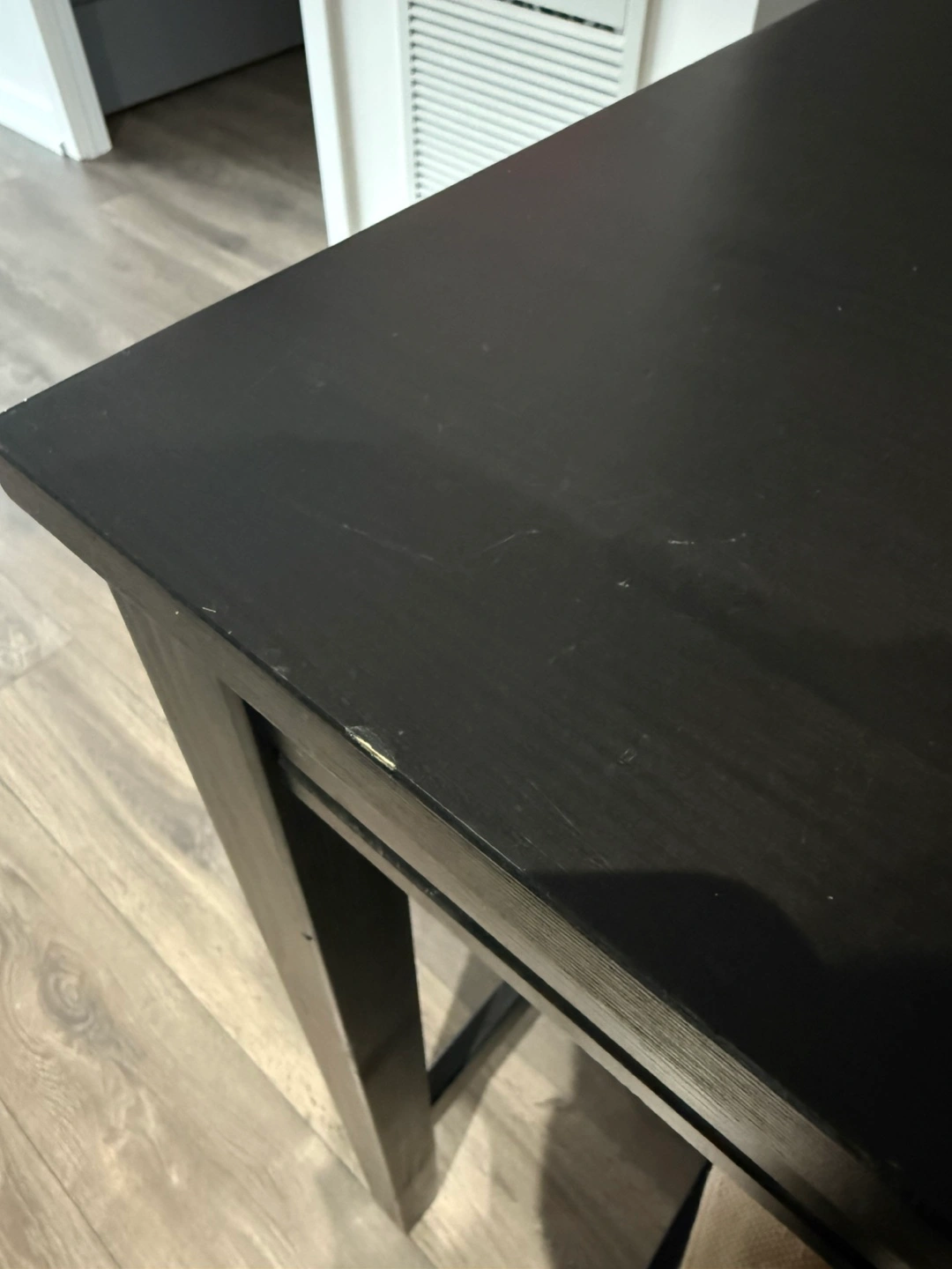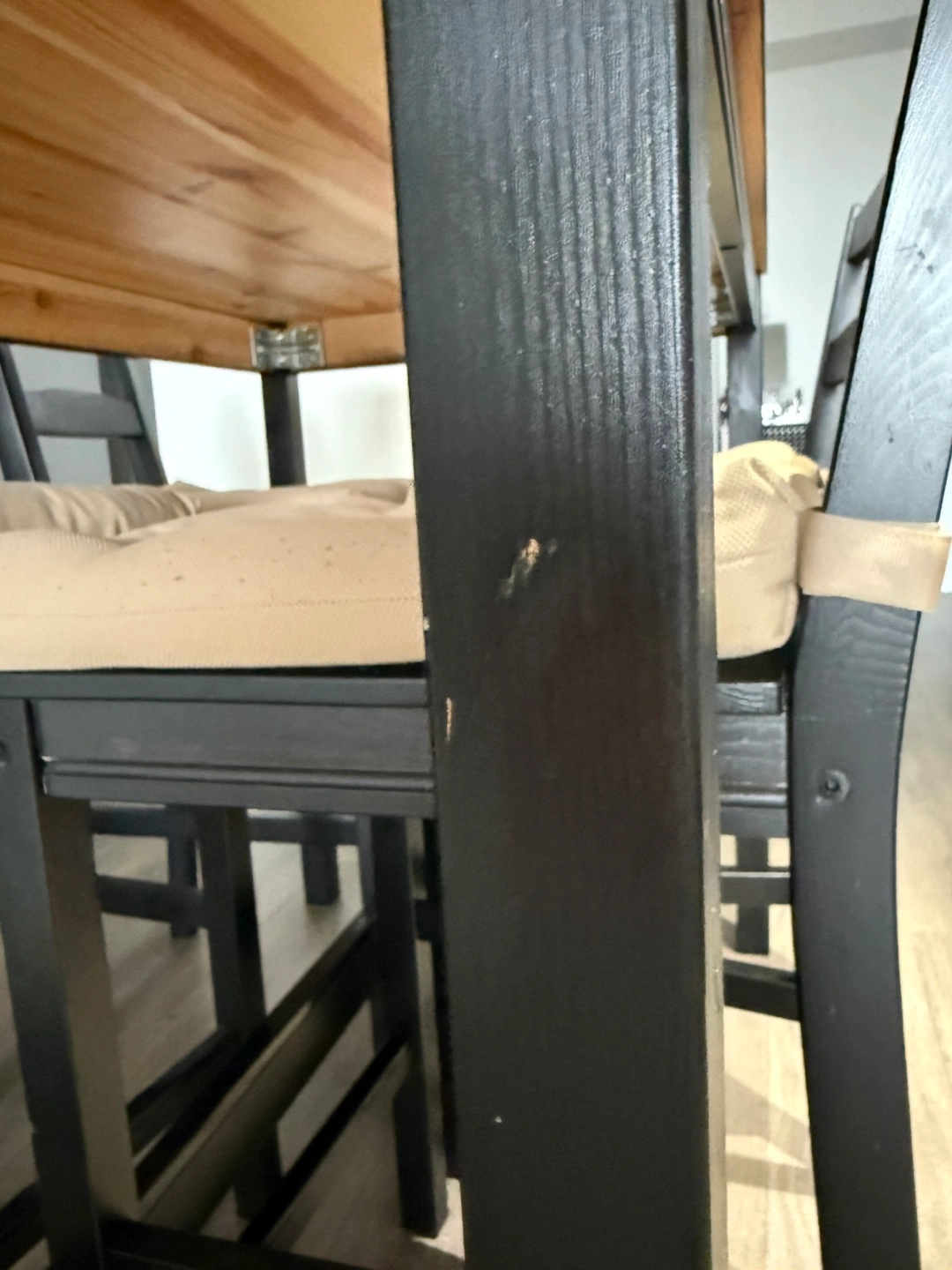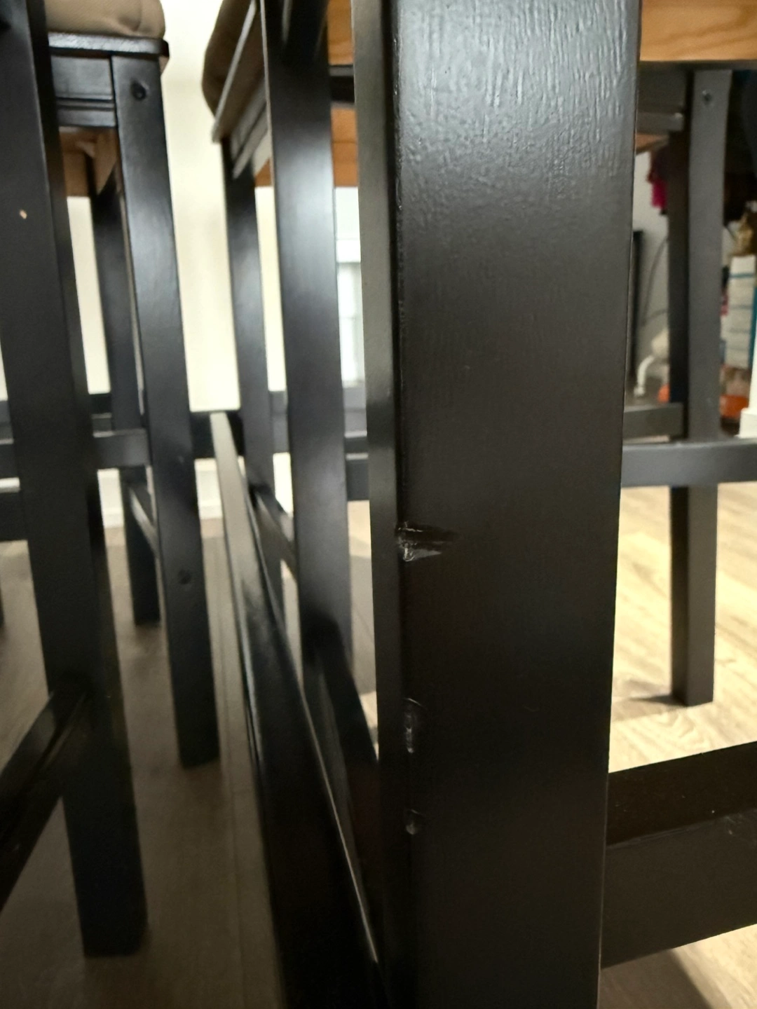 Five-piece dining set. Includes one table and four stools. Black finish. Minor wear and tear.