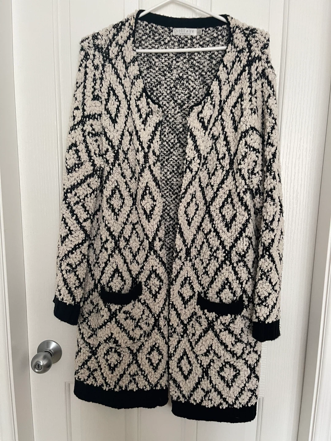 Cozy Solitaire cardigan featuring a black and cream diamond pattern. It has an open front and two front pockets. Perfect for layering over tops.