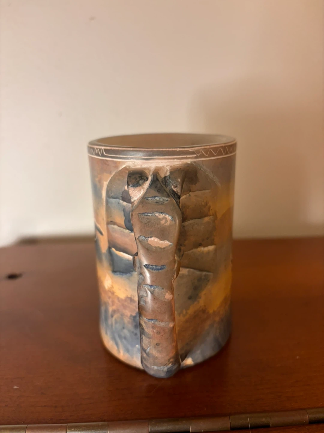 The body of the mug has a rich, layered glaze in warm browns, blues, and ochres, with decorative line detailing around the rim. Each angle reveals different textures and brushwork, emphasizing its artisan, handcrafted character.