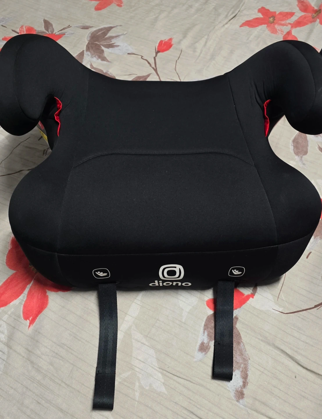 This is a Diono booster car seat in black. It's made of fabric and plastic. Designed for children 40-120 lbs. This was very rarely used like 10 times. It was wrapped and stored neatly. It was in a pet free home.