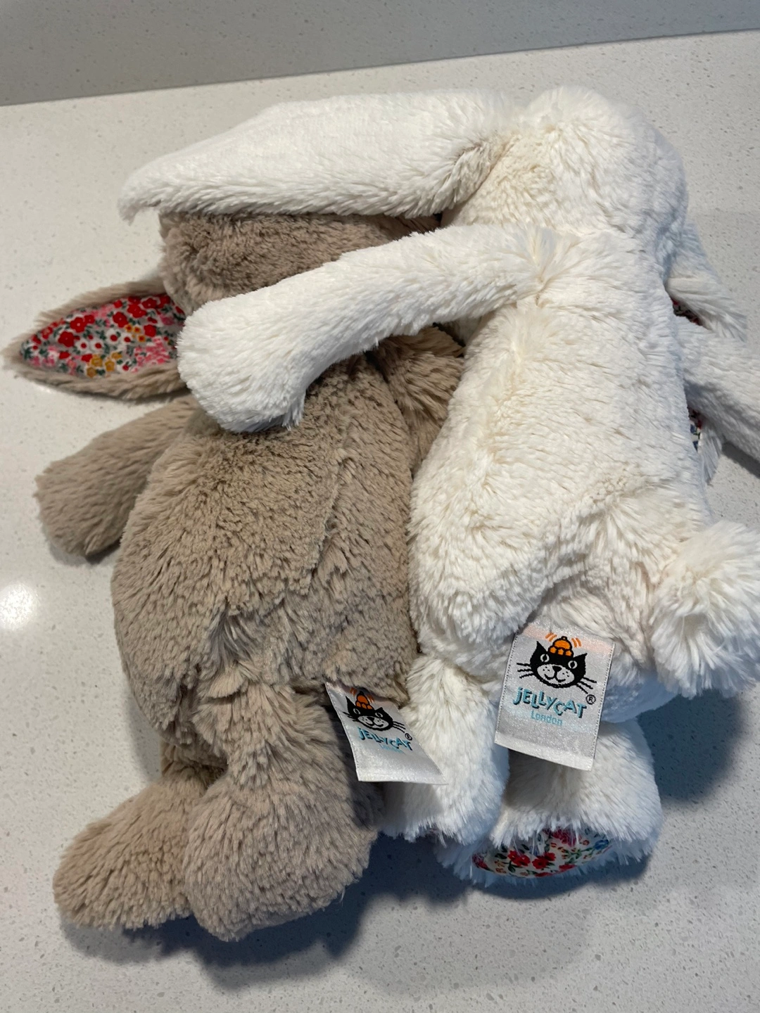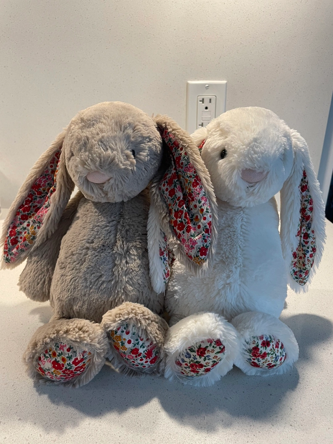 Selling two adorable Jellycat Blossom Bunnies! One is beige and the other is white. They both have cute floral patterns on the inside of their ears and on their feet. Super soft and cuddly!