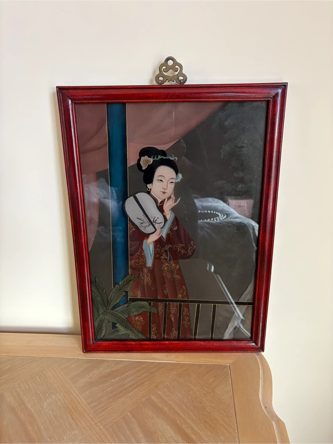 This is a lovely framed painting depicting a traditional Chinese woman. It's mounted in a rich, dark red wooden frame. The artwork is detailed and colourful, featuring floral motifs. It comes ready to hang with a decorative brass hook.