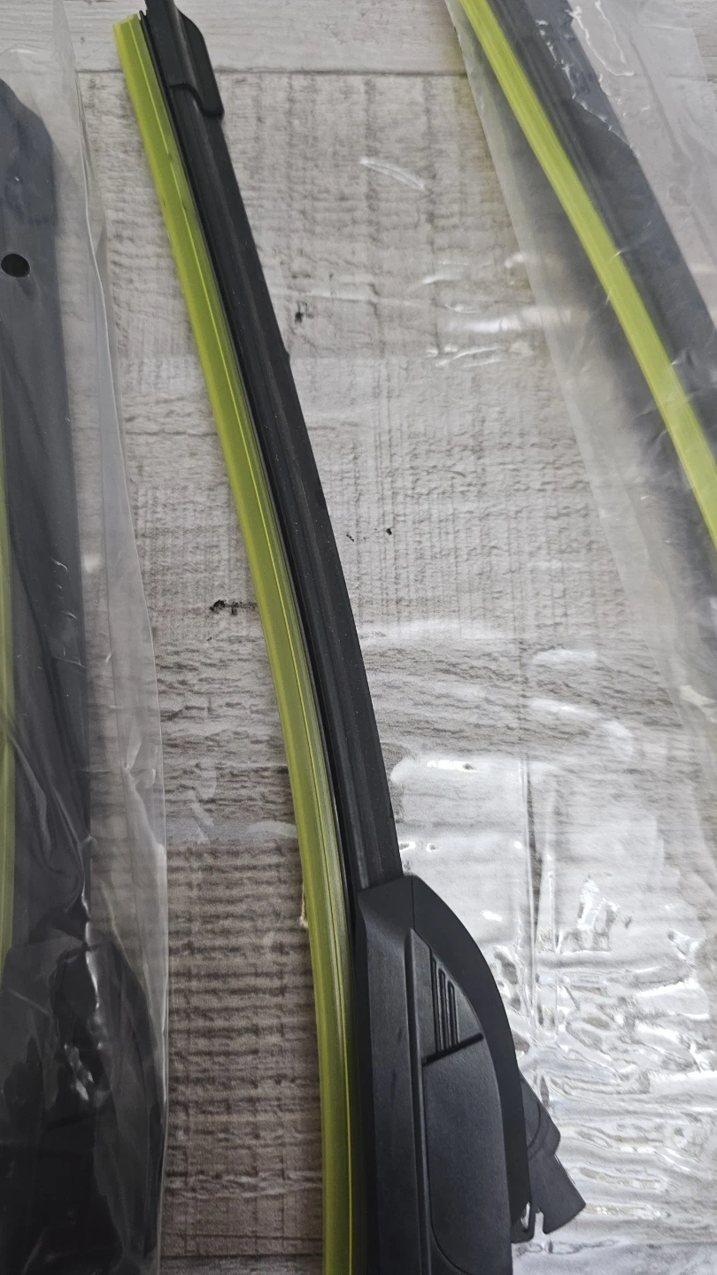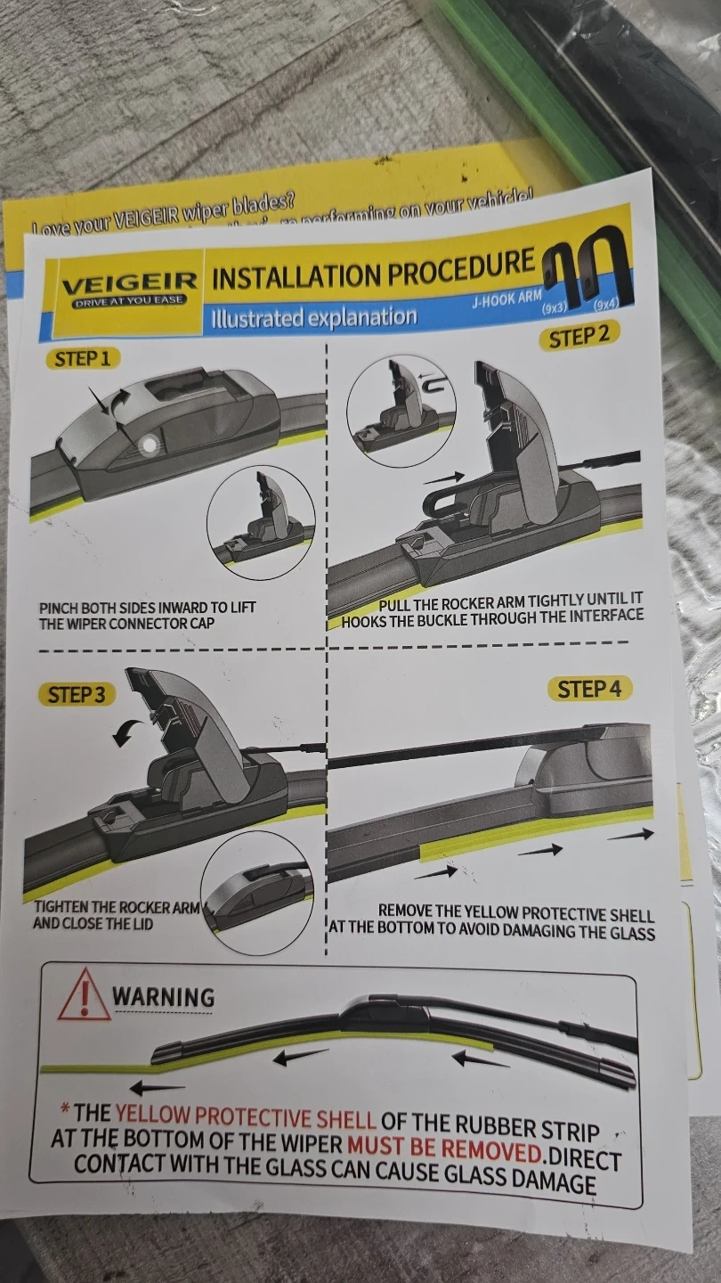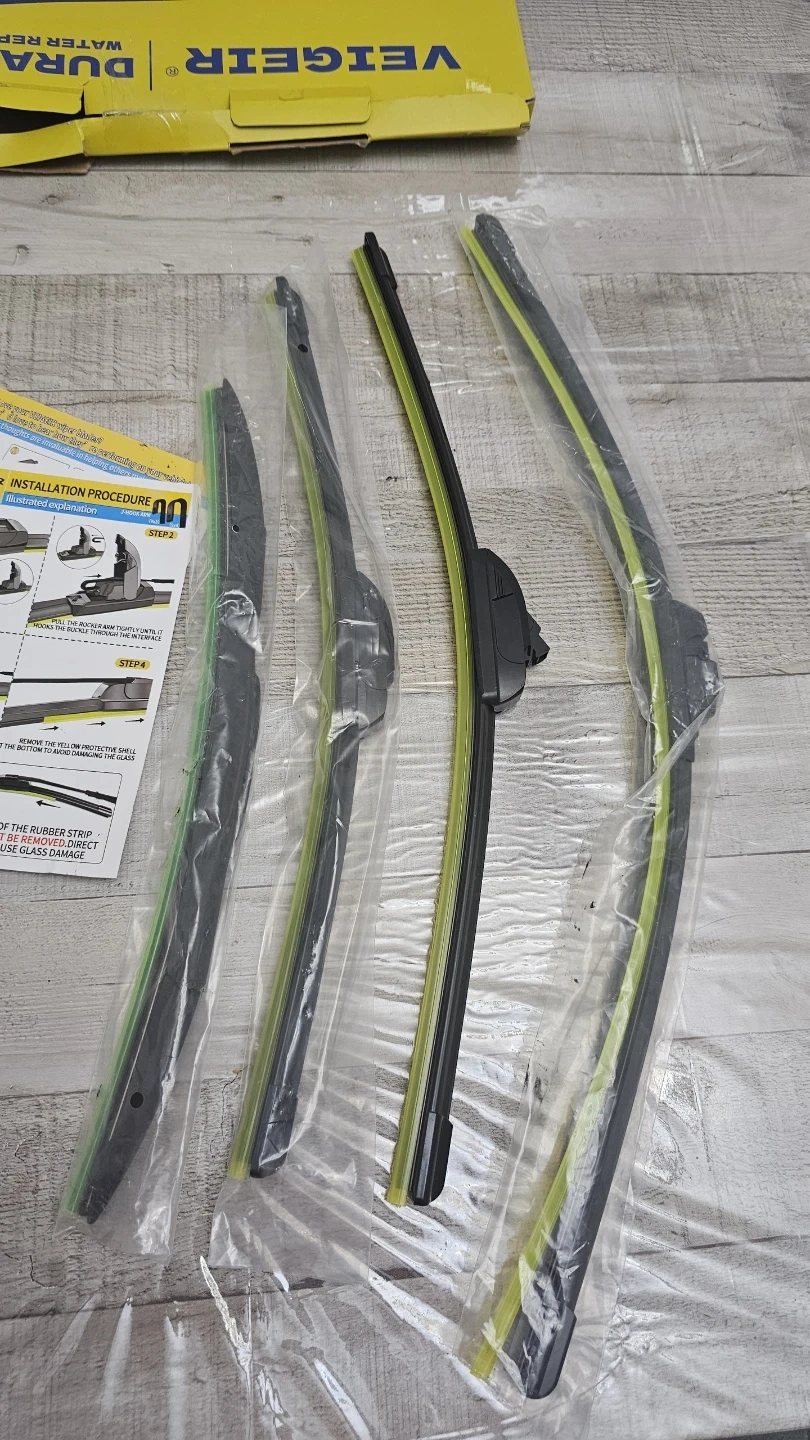 Set of 4 VEIGEIR DuraWipe wiper blades, featuring Ultra Clean Swipe Tech for water repellency. Includes illustrated installation procedure. Remember to remove the yellow protective shell from the rubber strip before use! Cash only