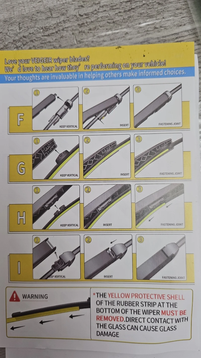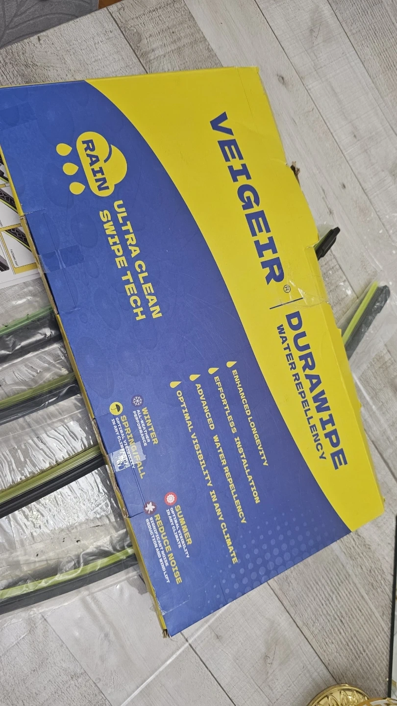 Set of 4 VEIGEIR DuraWipe wiper blades, featuring Ultra Clean Swipe Tech for water repellency. Includes illustrated installation procedure. Remember to remove the yellow protective shell from the rubber strip before use! Cash only