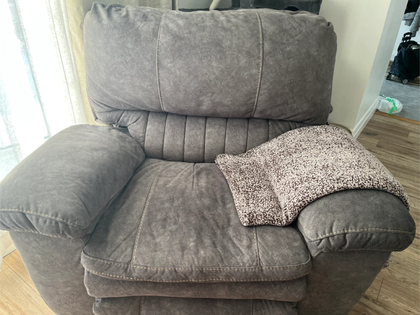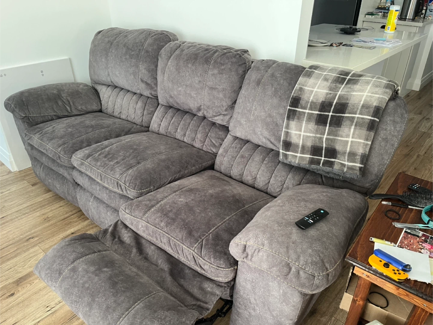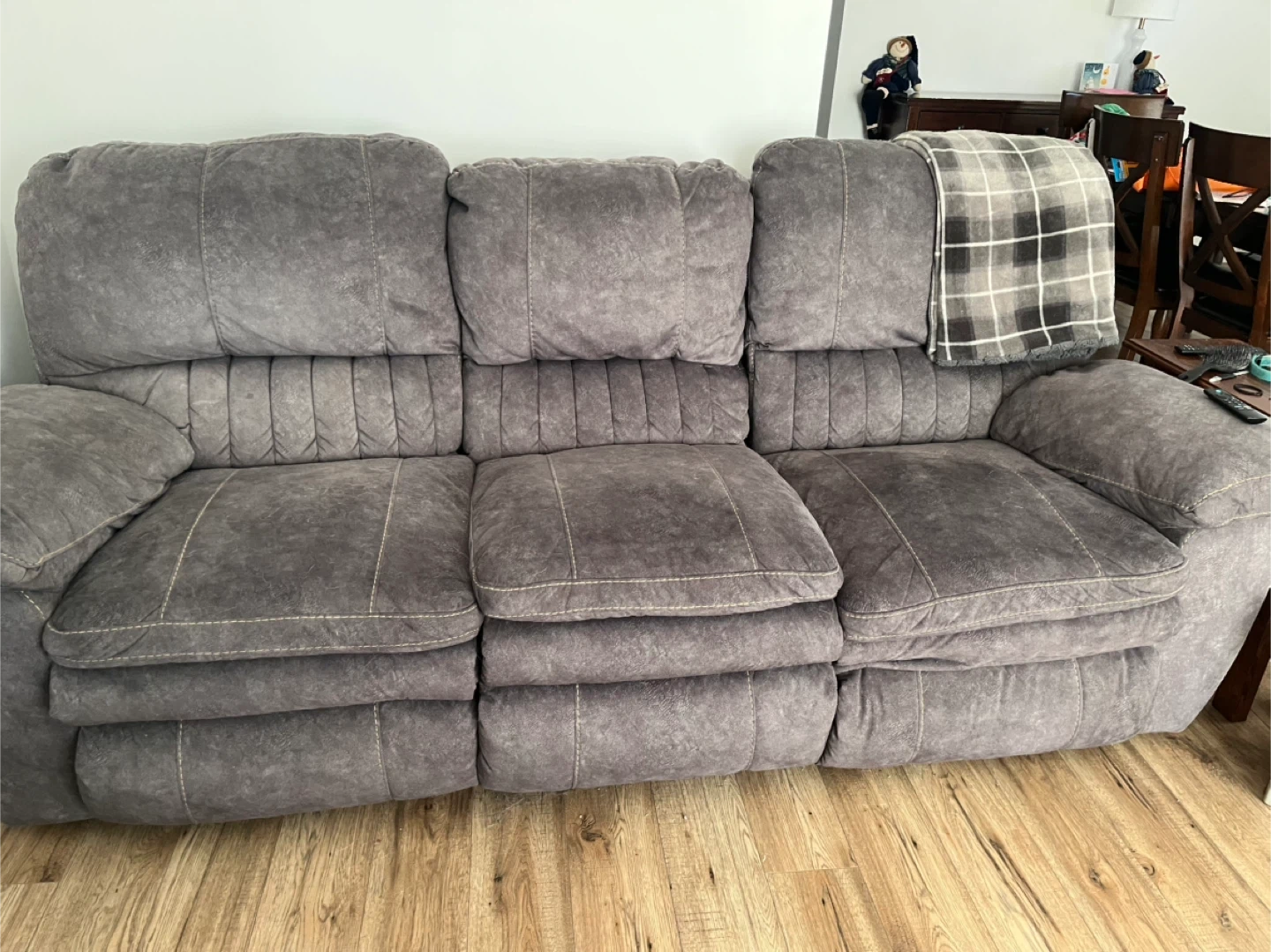 This is a grey reclining sofa with plush cushions. It's made of a soft fabric material. This sofa offers comfortable seating for multiple people. Asking $1,000 or best offer. Pet friendly home. Measurements are L- 92.3 inches. W-35.2 inches. and H-38.8 inches.