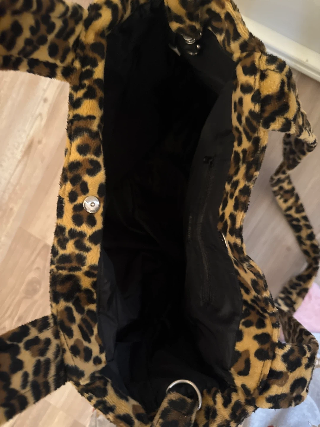 Chic leopard print plush tote bag. It features a soft, furry exterior and a black interior lining. Includes one interior zipper pocket for secure storage. This tote's unique texture makes it a fun accessory!