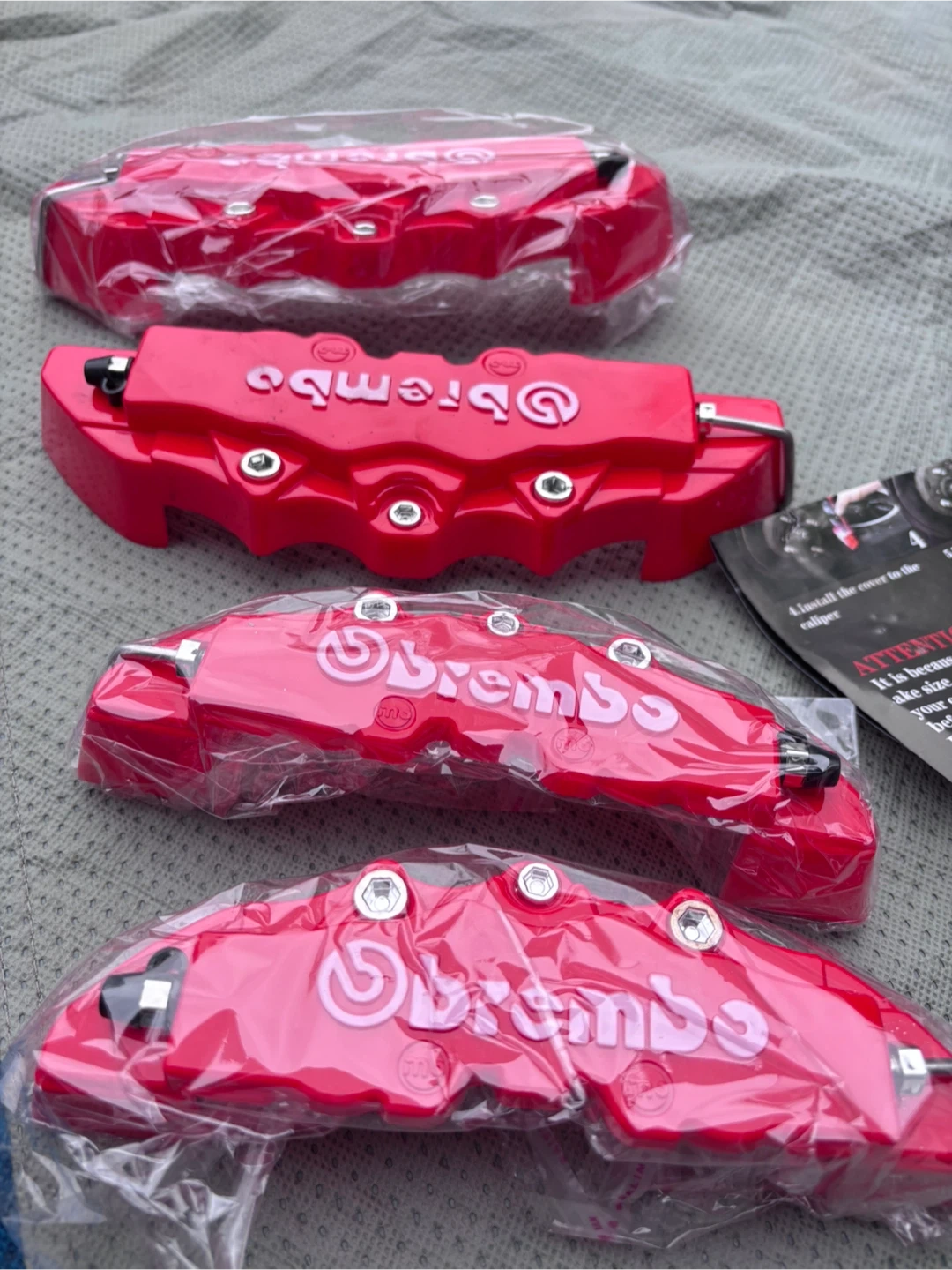 Set of four red Brembo brake caliper covers. Includes installation instructions. Made from durable material. These covers are designed to fit over your existing brake calipers.