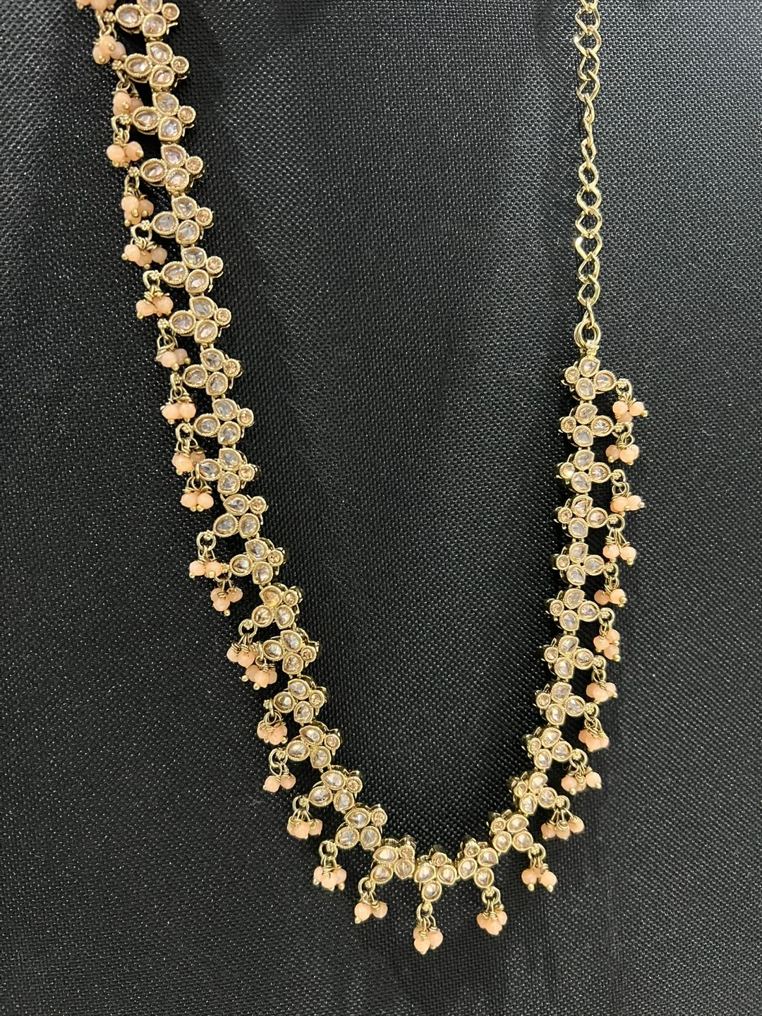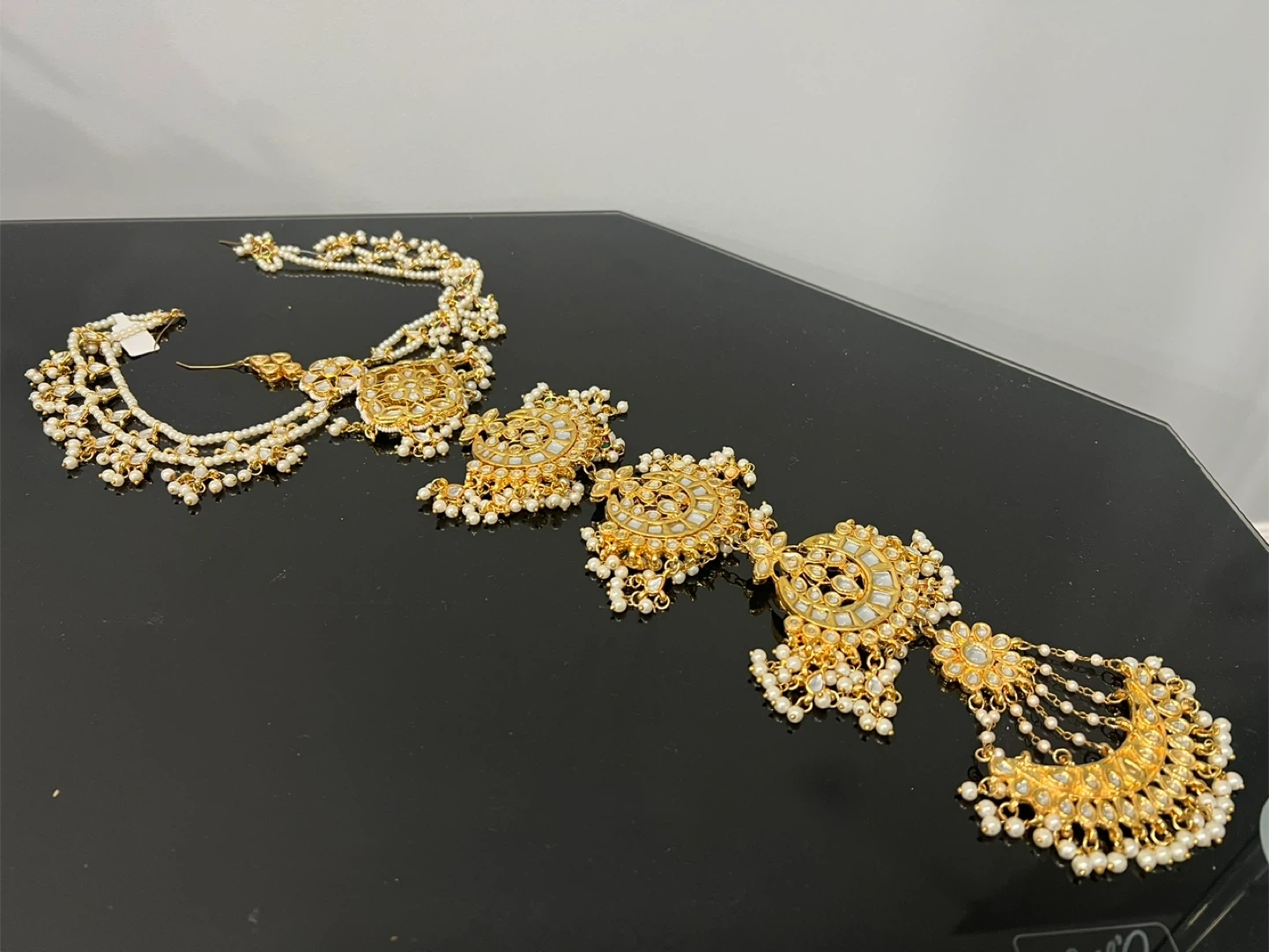 Beautiful Indian bridal jewellery set. Includes a necklace and hair accessory. The necklace is gold with small clear stones and peach-colored beads. The hair accessory is gold with white beads and shell-like details. Perfect for a wedding or special occasion!