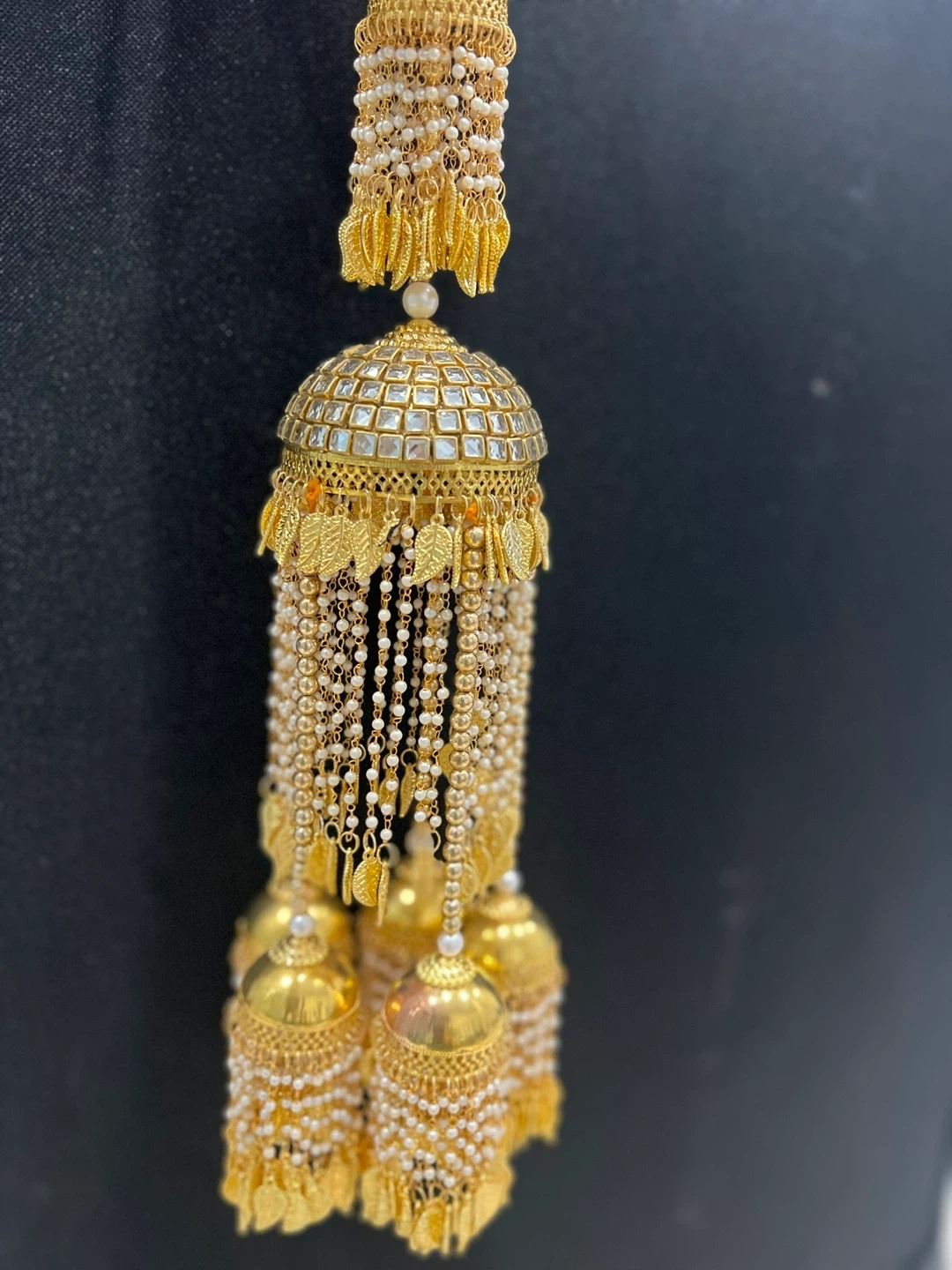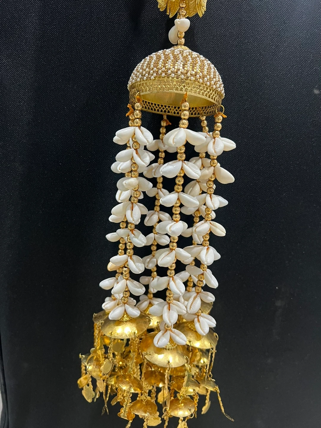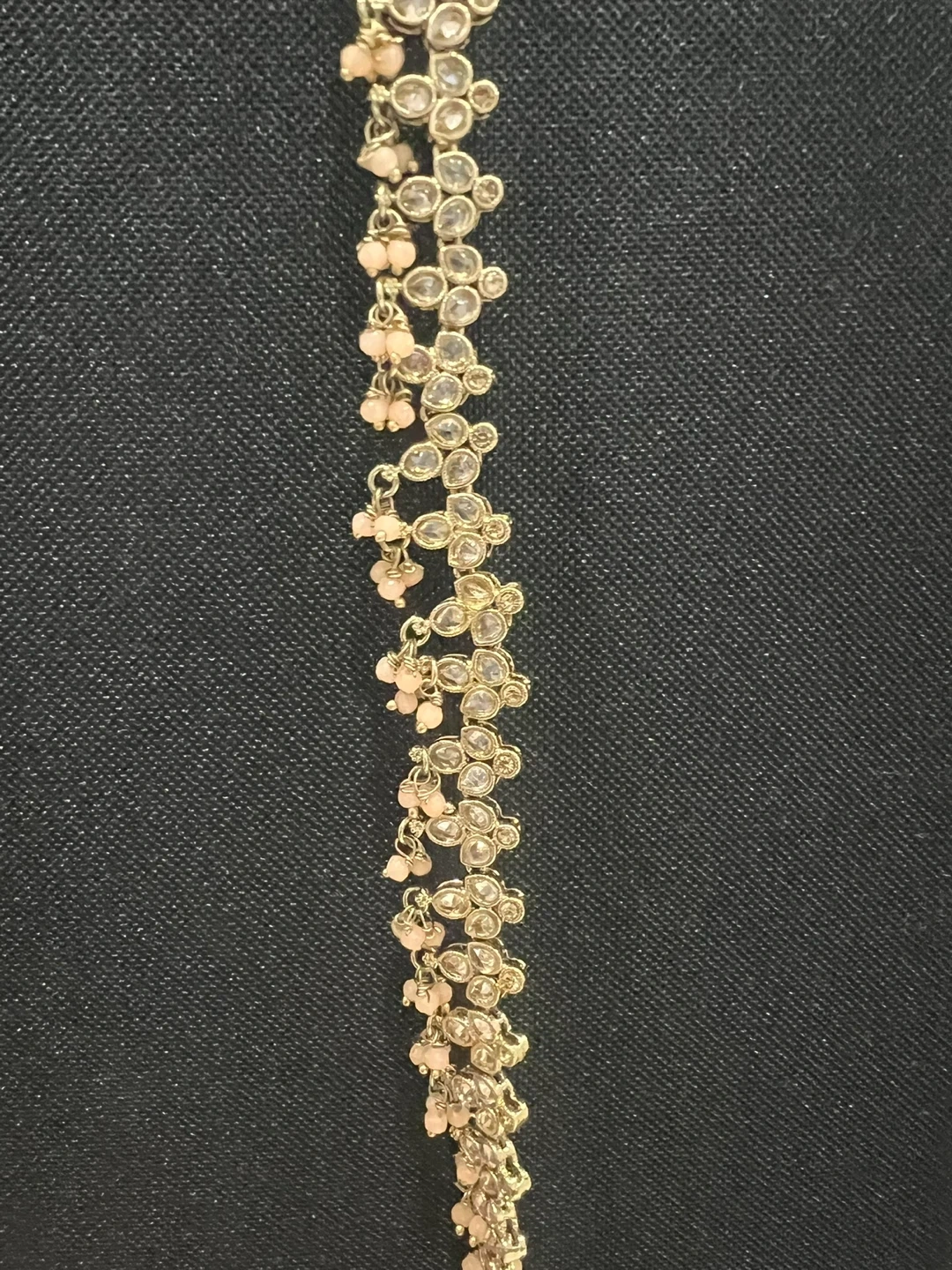 Beautiful Indian bridal jewellery set. Includes a necklace and hair accessory. The necklace is gold with small clear stones and peach-colored beads. The hair accessory is gold with white beads and shell-like details. Perfect for a wedding or special occasion!