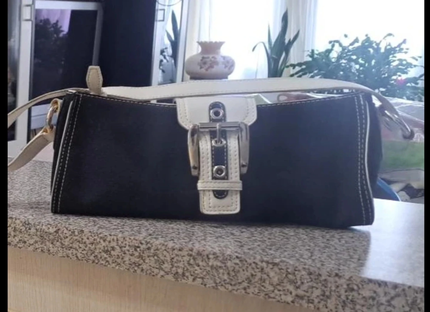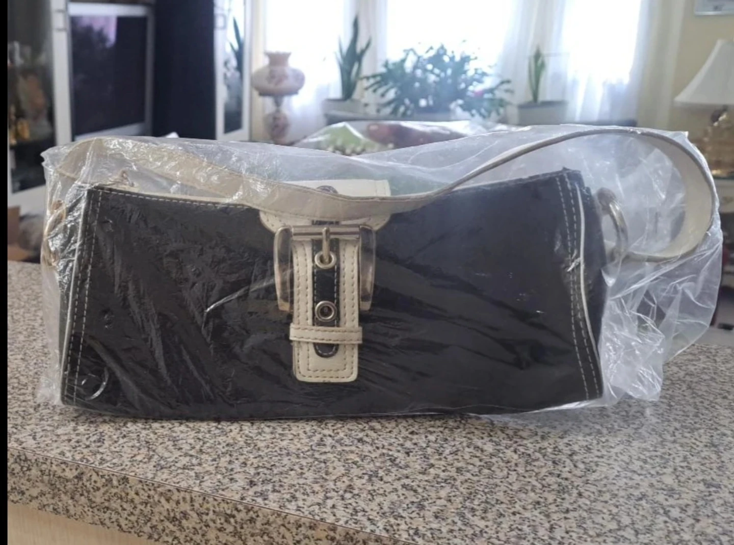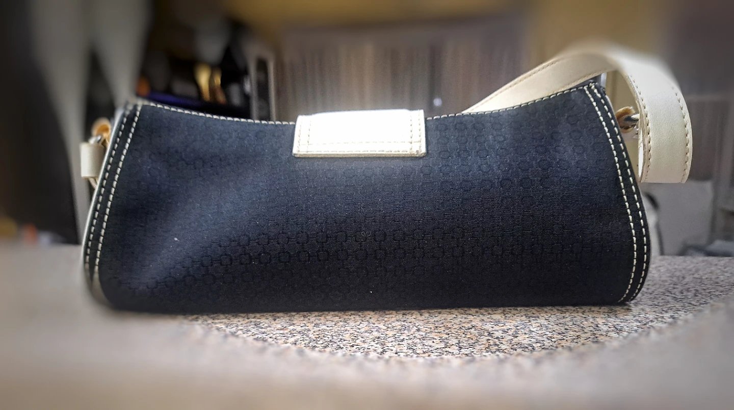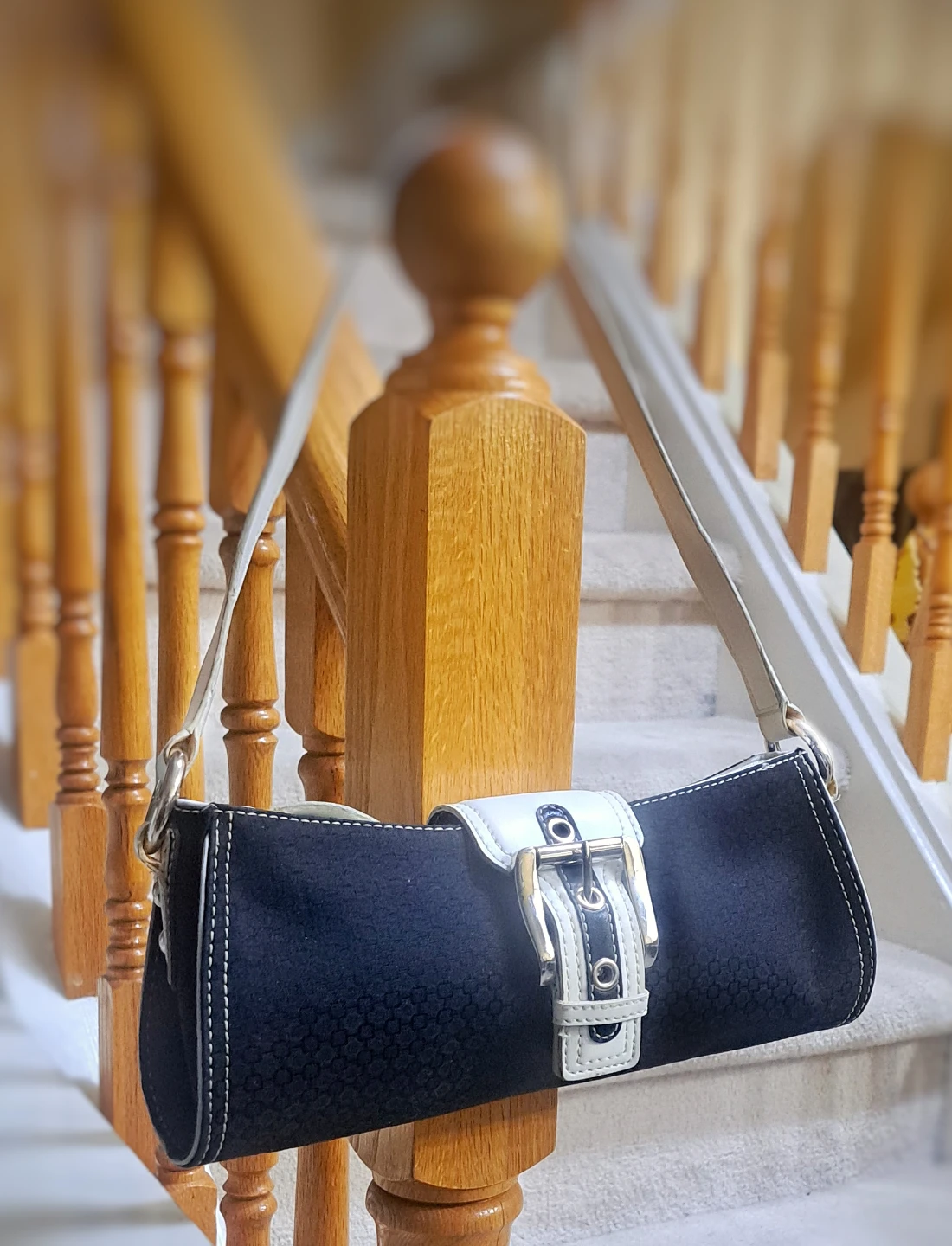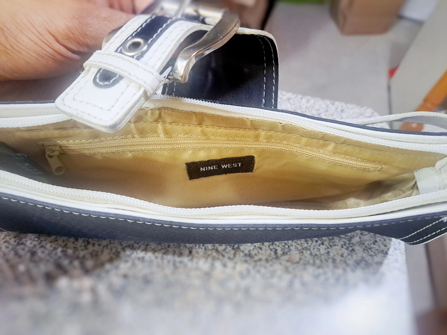 Nine West- A Dark Denim shoulder bag with white trim and buckle detail. It has a classic buckle closure and a comfortable shoulder strap. This stylish bag is perfect for everyday use.