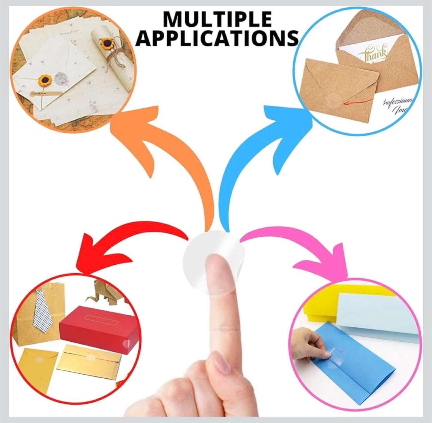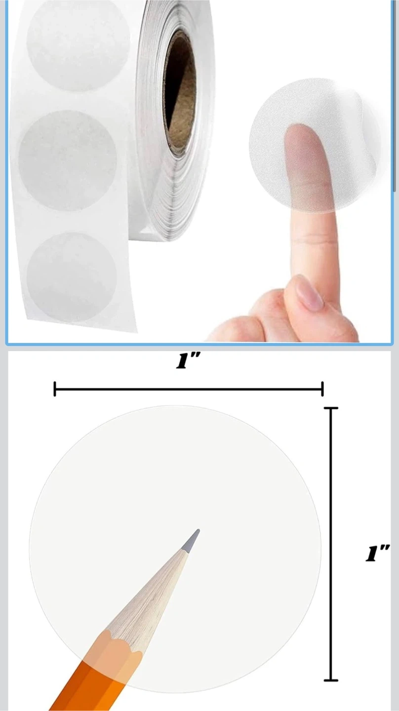 This is a roll of 1-inch clear round stickers. They're great for sealing envelopes, decorating packages, or craft projects. The stickers are made of transparent material.