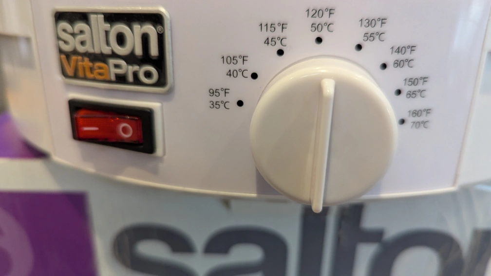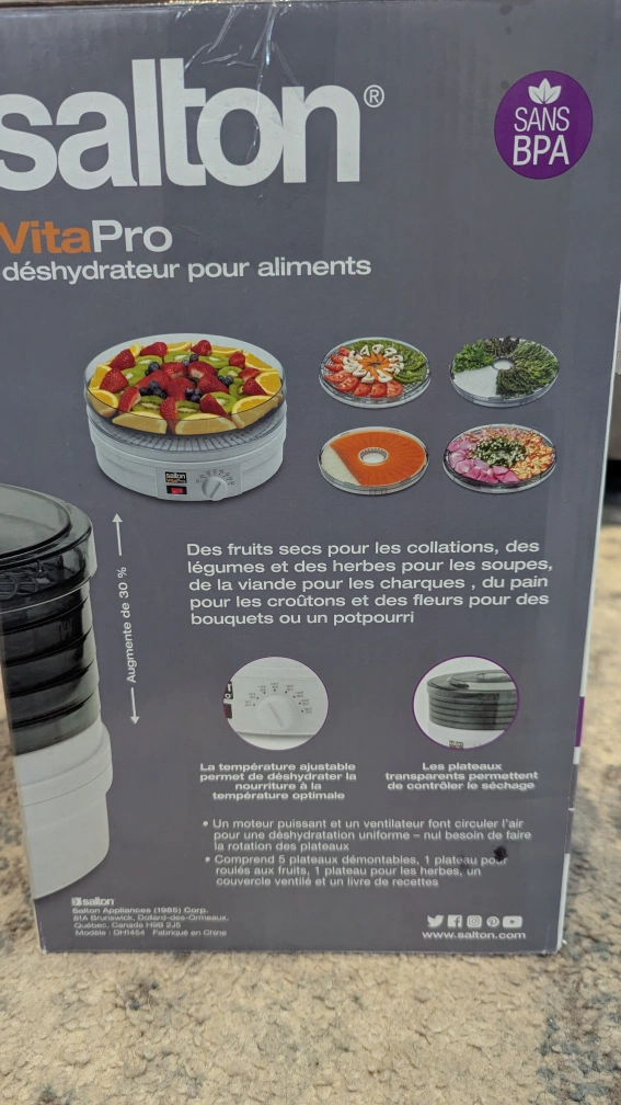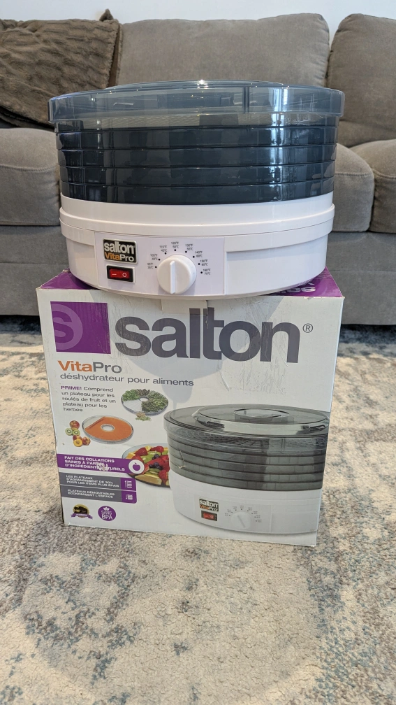 Brand New this Salton VitaPro food dehydrator is great for drying fruits, veggies, and herbs. It's BPA-free and includes 5 stackable trays. The adjustable temperature control goes up to 160°F. It's useful for making healthy snacks or preserving food.