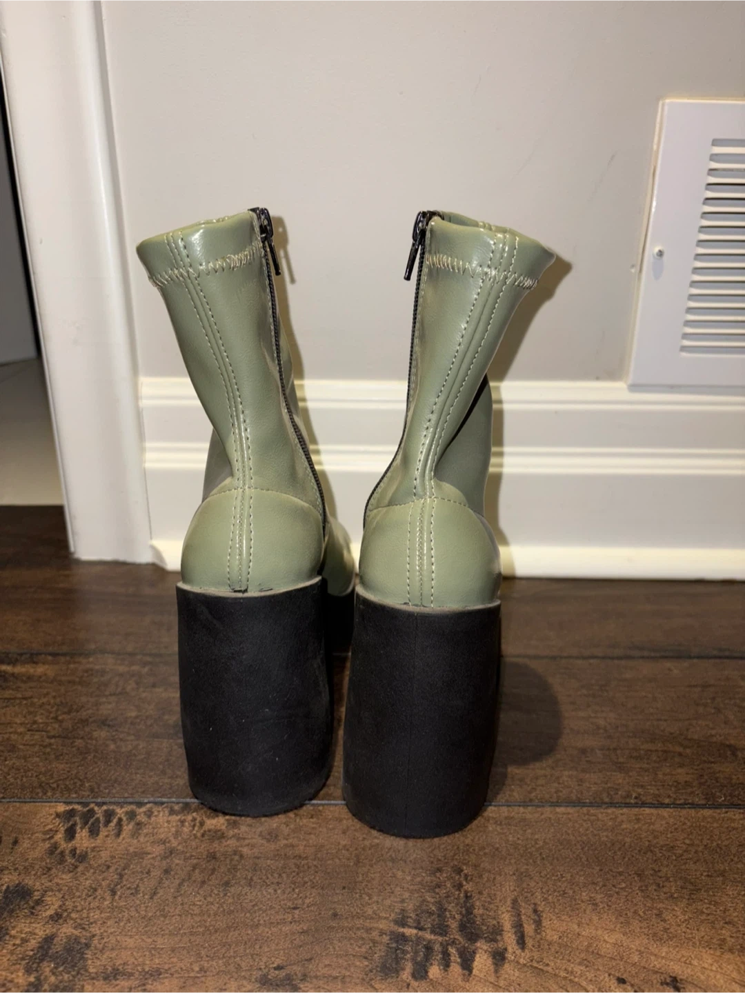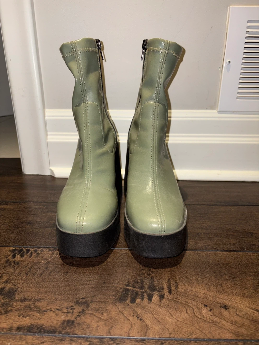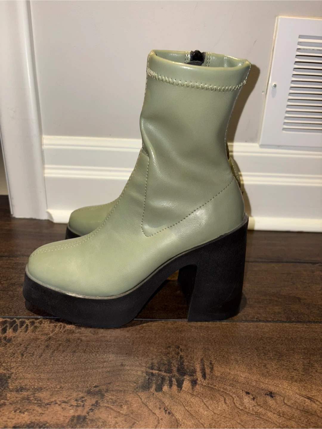 These light green ankle boots have a chunky black platform and heel. They're made with a stretchy upper and a zipper closure for easy on and off.