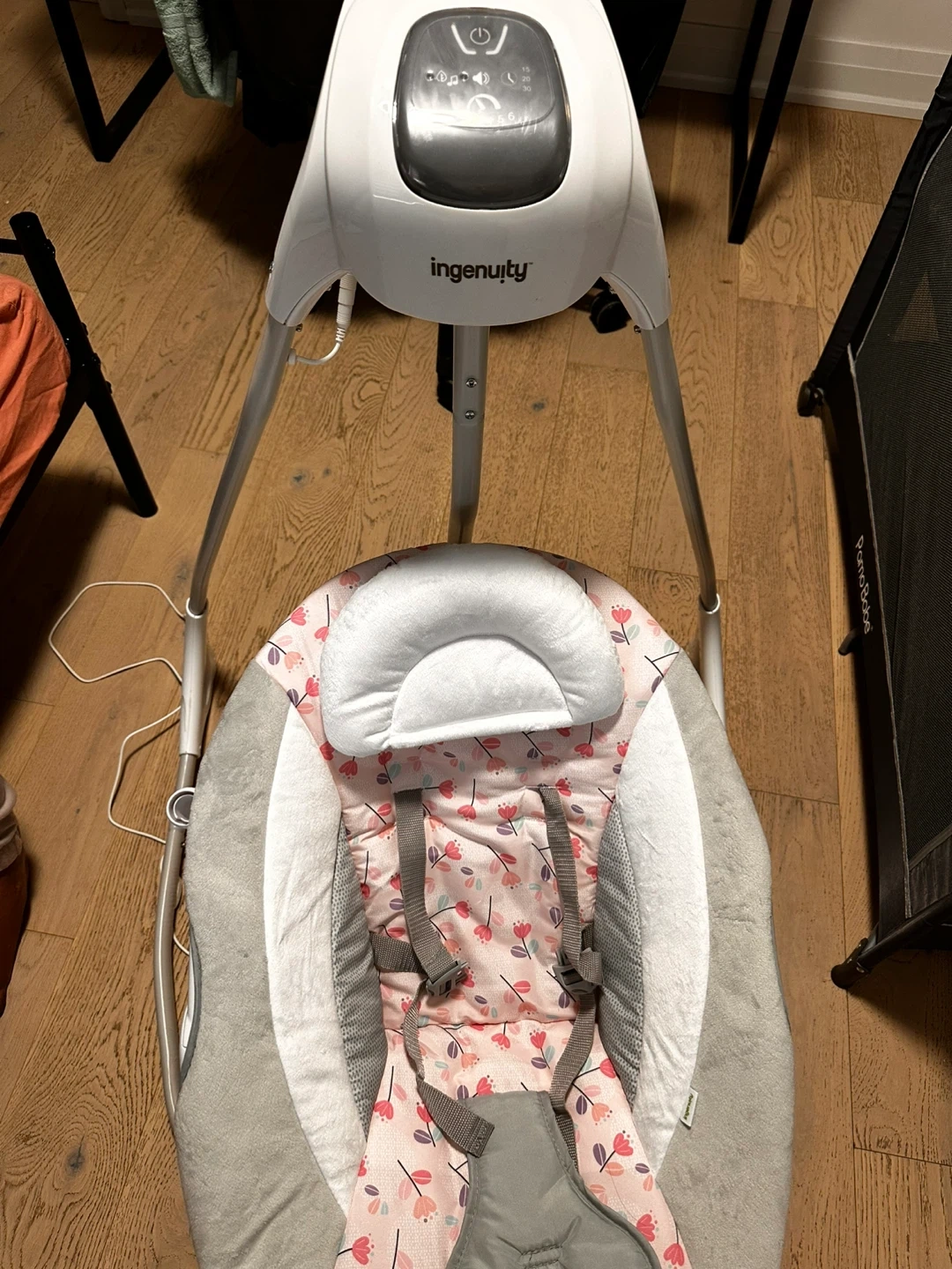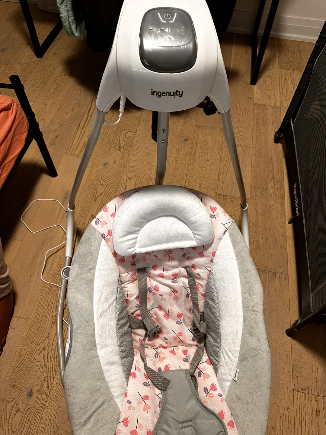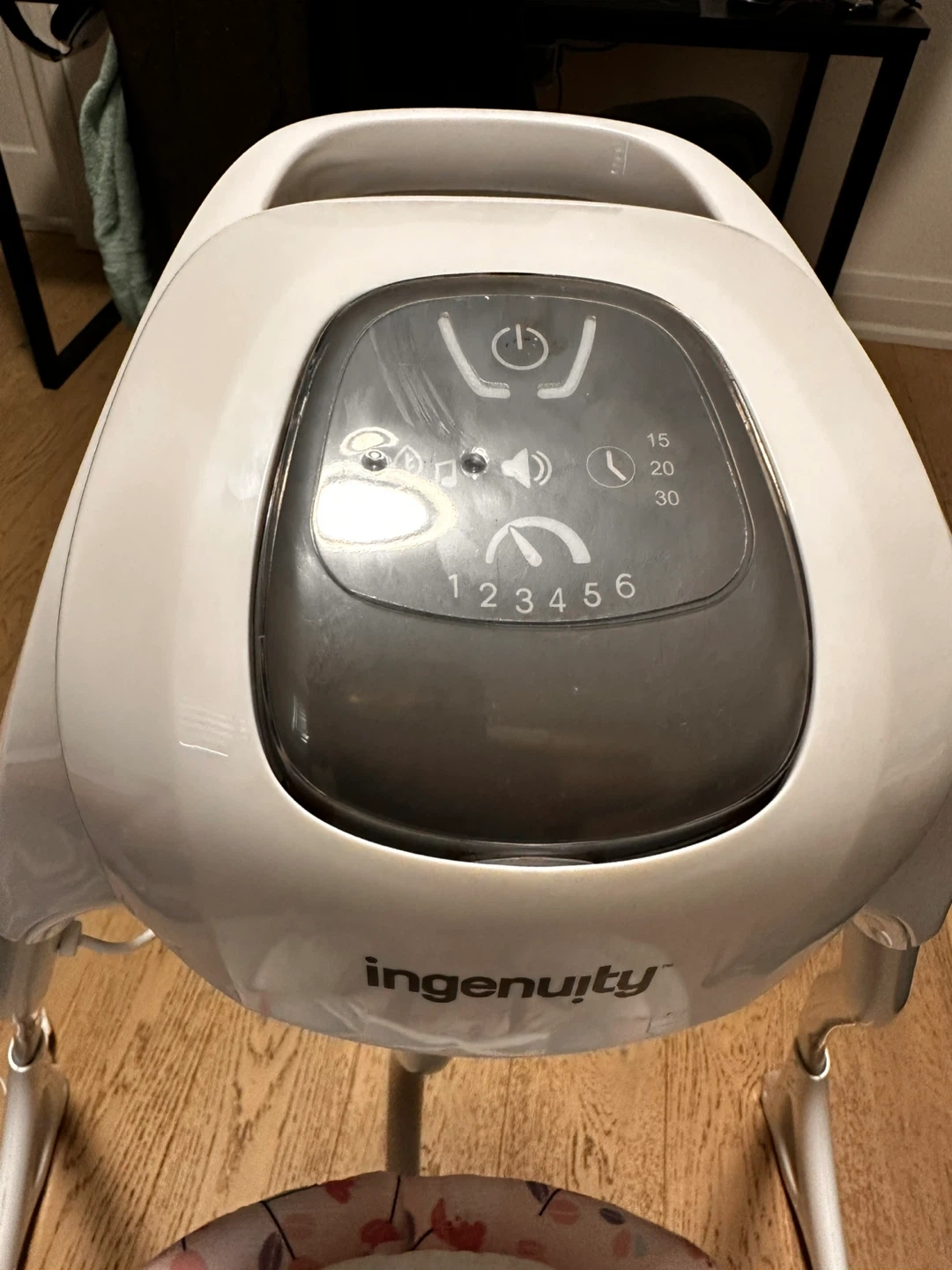 Selling a gently used Ingenuity baby swing. It features a cute floral design and is in great condition. It has different speed settings and a timer to help soothe your little one. Perfect for keeping baby happy and entertained! Never used.