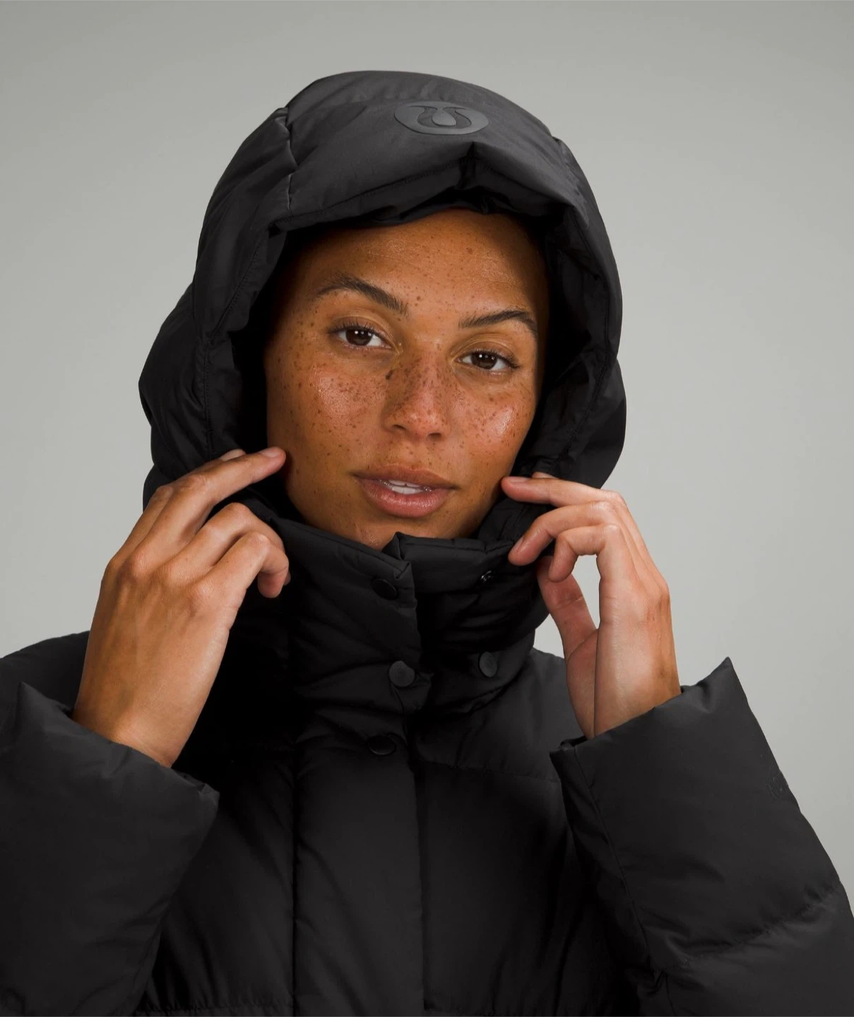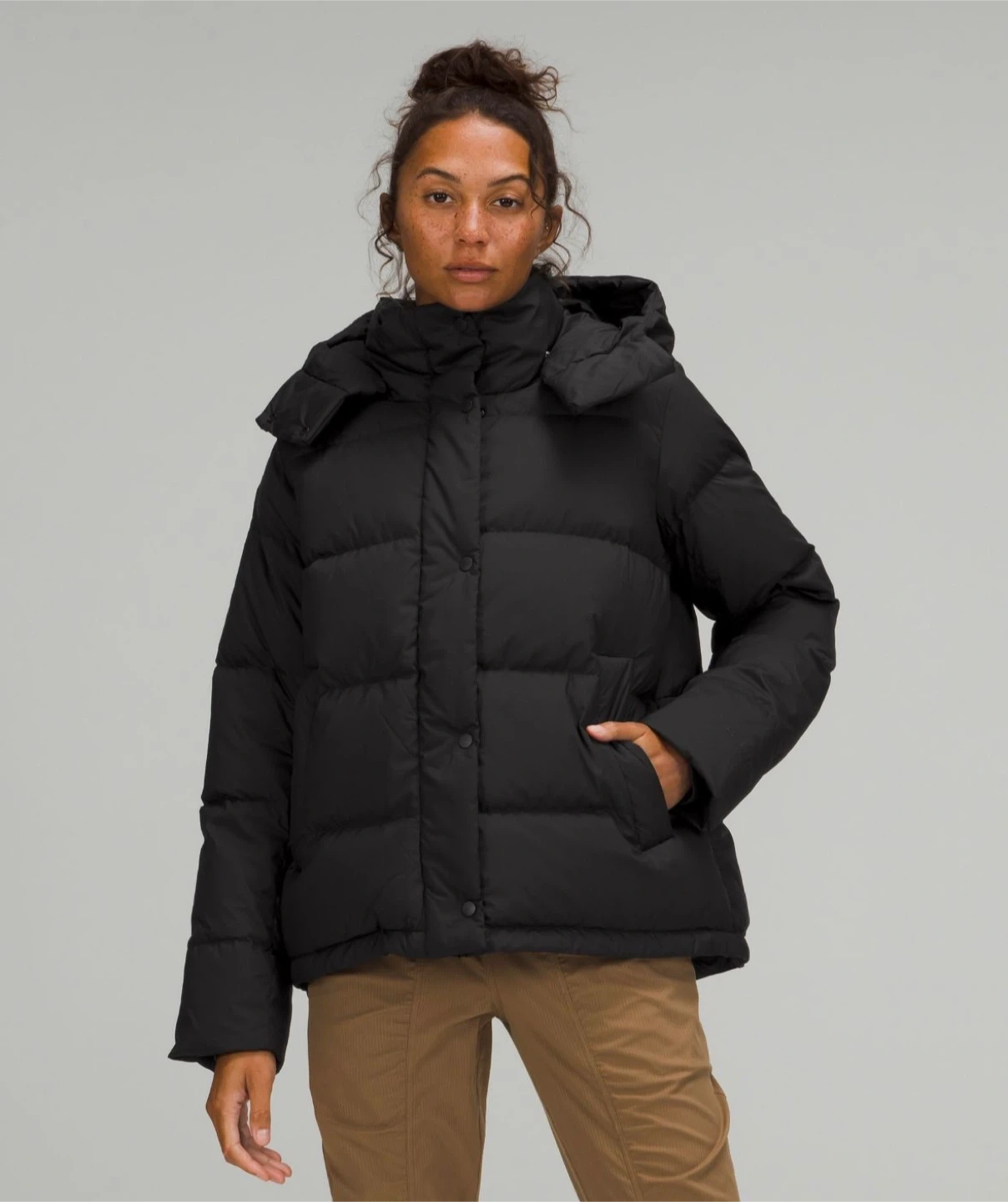 This black 600-Down-Fill Lululemon puffer jacket is warm and stylish. It has a hood and snap closures. It's made for keeping cozy during colder weather.