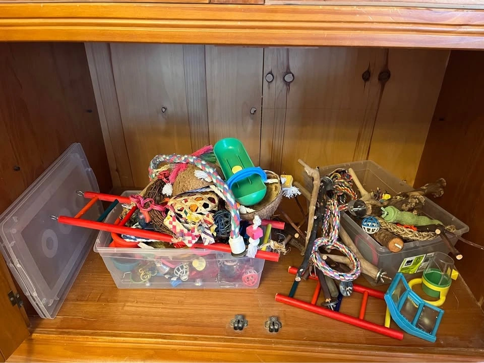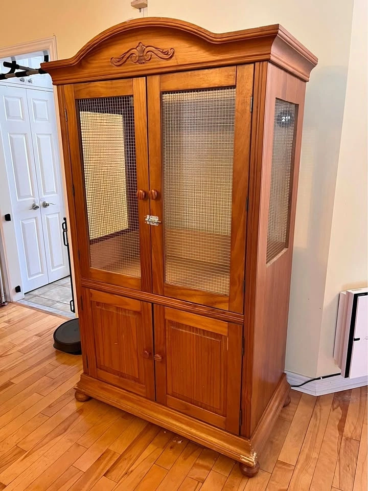 Custom made pine armoire turned flight cage. Stainless steel wire, nine eyeholes on ceiling to hang toys from, storage underneath. All toys and perches pictured included. Suitable for small birds such as budgies.