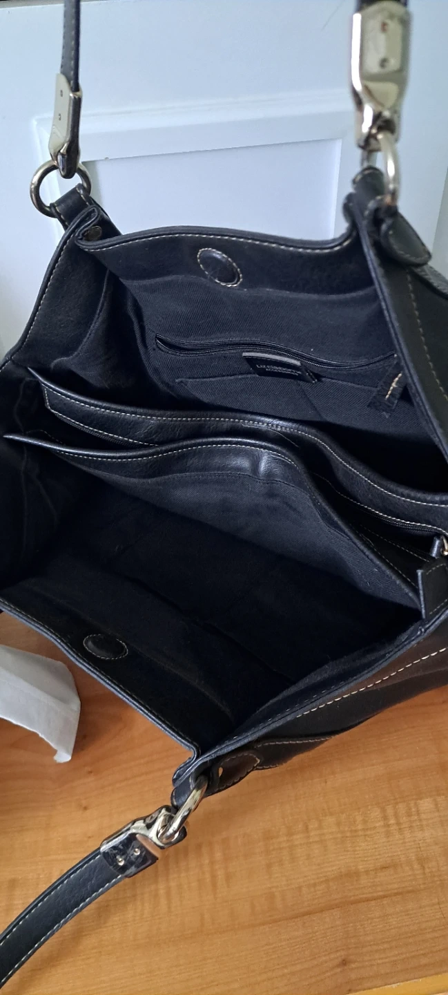 This Liz Claiborne shoulder bag is black with a faux leather exterior. It features multiple interior pockets for organization. A classic accessory for everyday use!