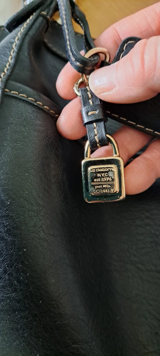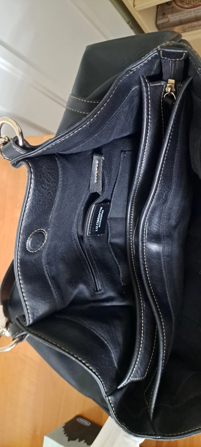 This Liz Claiborne shoulder bag is black with a faux leather exterior. It features multiple interior pockets for organization. A classic accessory for everyday use!