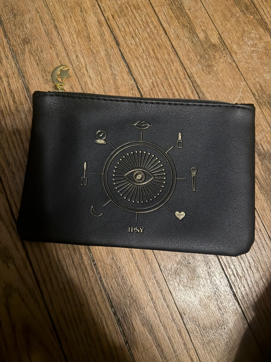 This is a black makeup bag from Ipsy. It features a celestial-themed design with an eye in the center, surrounded by makeup and celestial icons. The zipper pull has a moon and star charm.