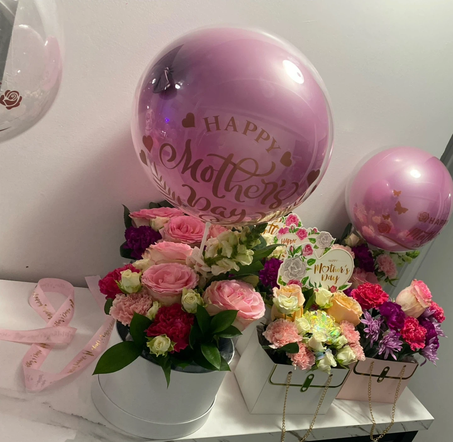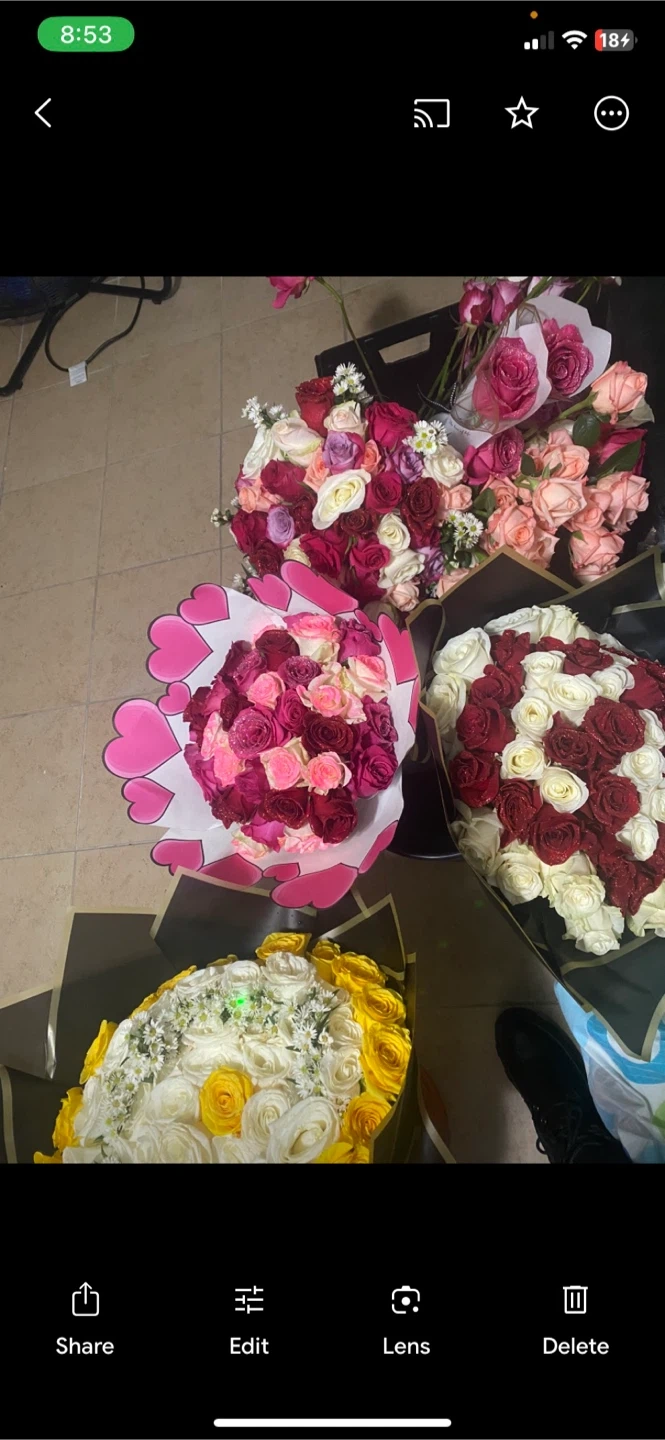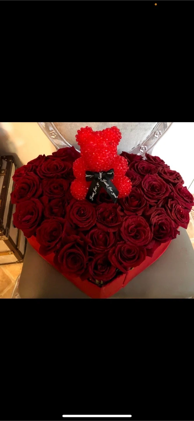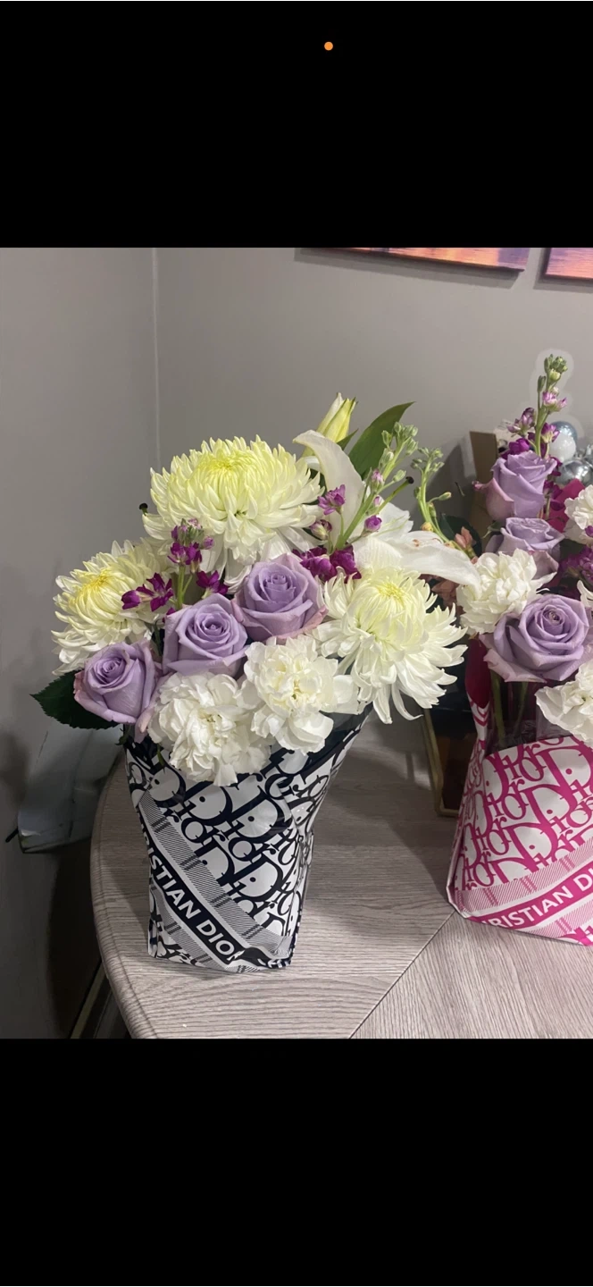Beautiful floral arrangement featuring purple roses, white chrysanthemums, and accent flowers. Arranged in a unique vase covered in Dior-inspired fabric. It's a stunning piece for any occasion!custom orders available for pickup