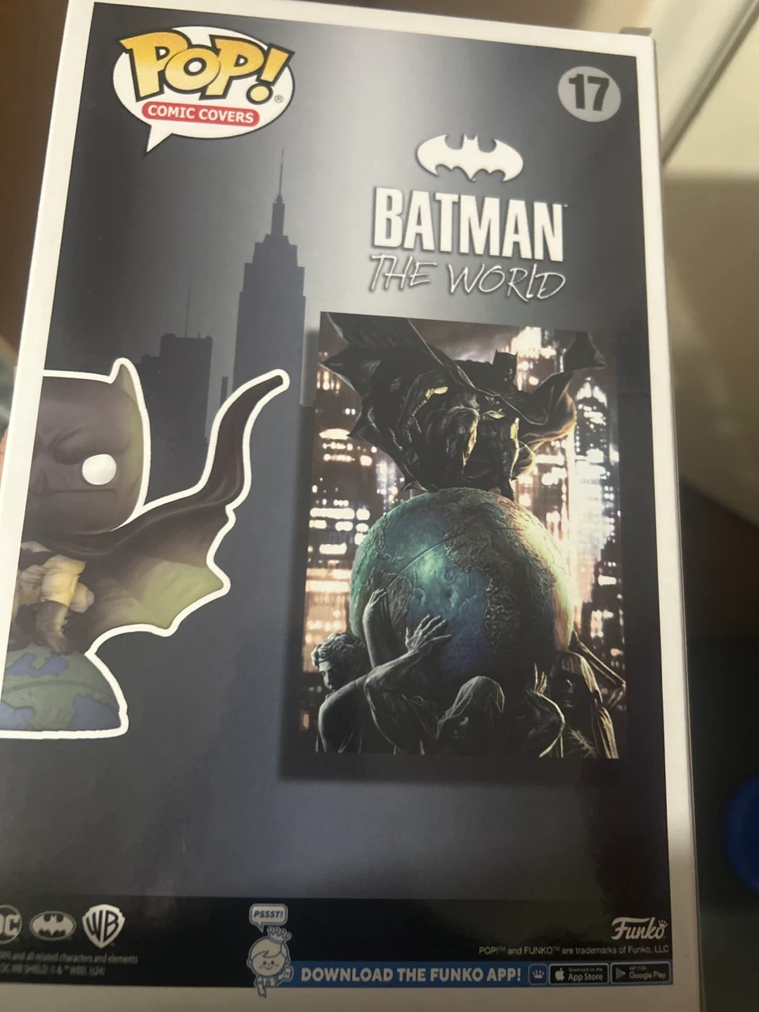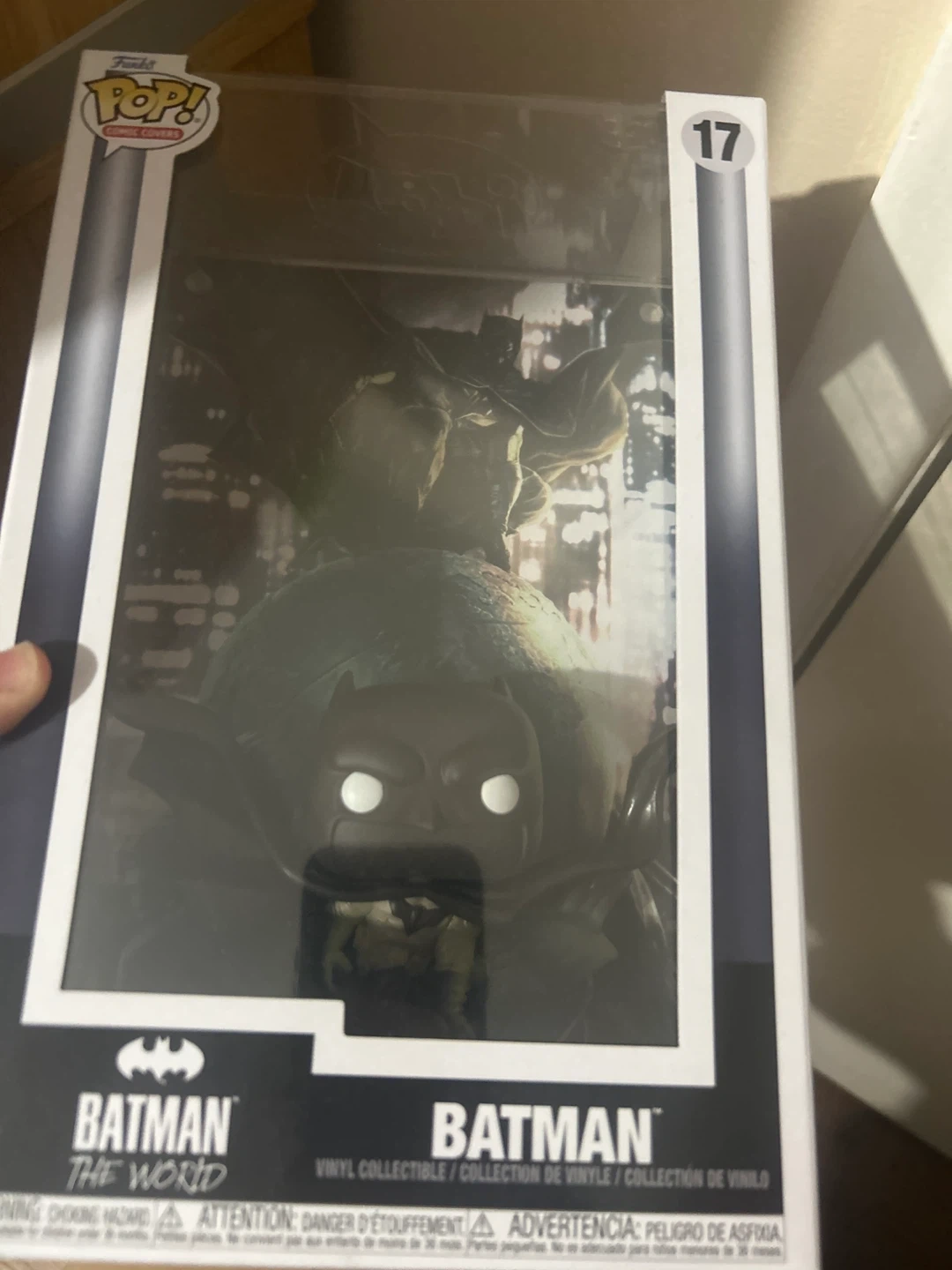 This is a Funko Pop! Comic Covers vinyl collectible figure of Batman. It's number 17 in the series, featuring Batman: The World. The collectible is in its original packaging.
