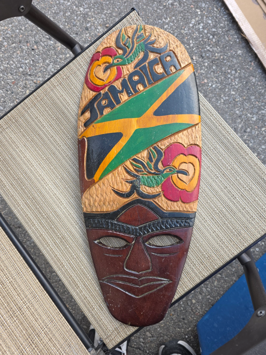 Hand-carved wooden mask. Features Jamaican flag colours and hummingbirds. Oval shape. Great for home decor.