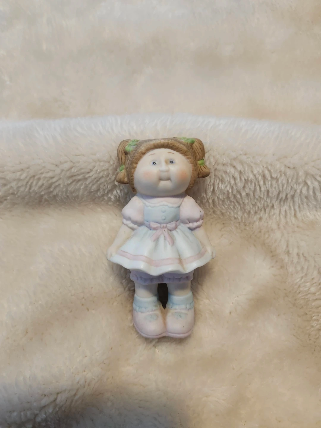 This is a Cabbage Patch Kids porcelain figurine is in excellent condition. It's from 1984 and made in Taiwan. The figurine is dressed in a blue and white dress with pink accents.