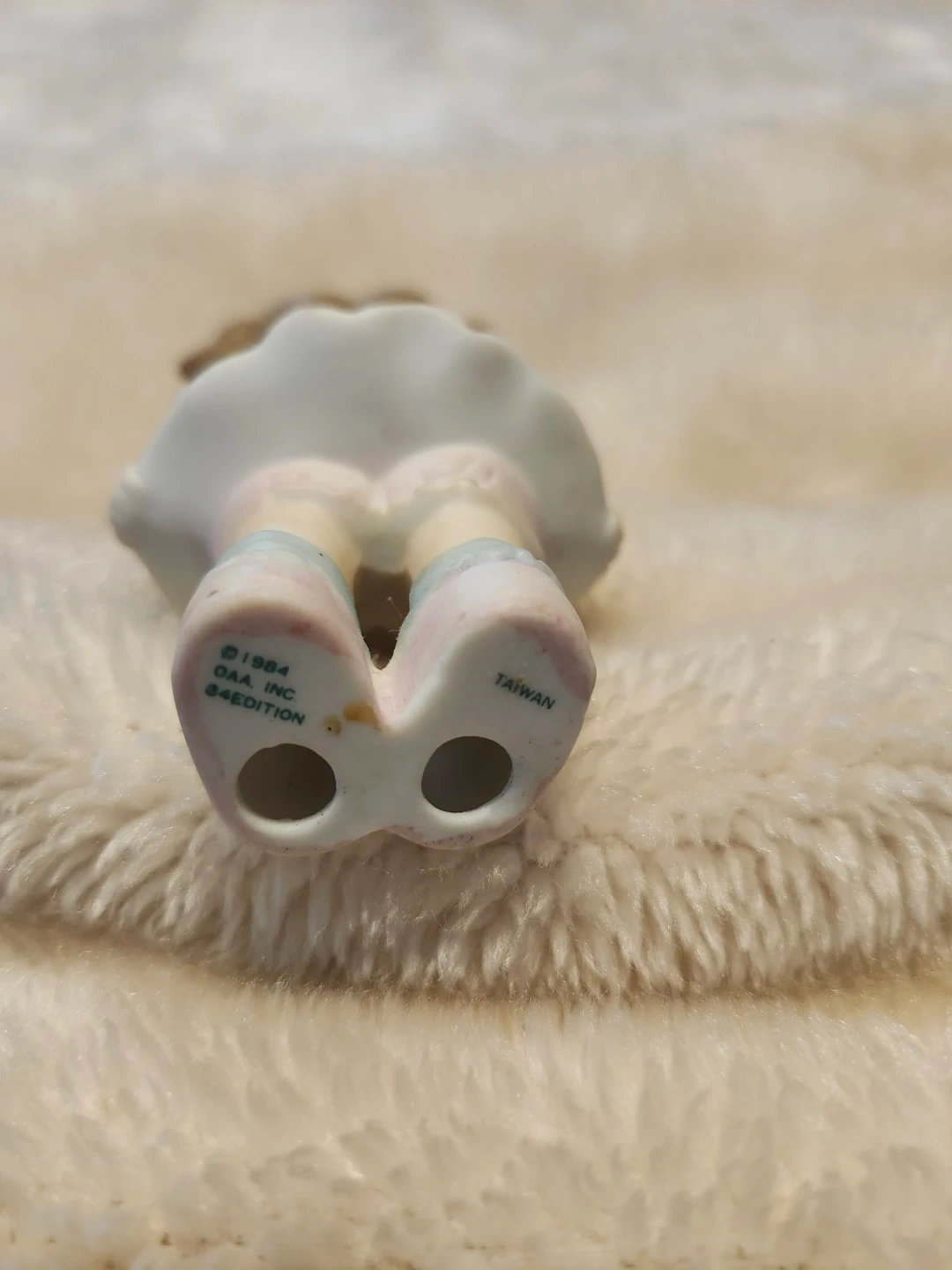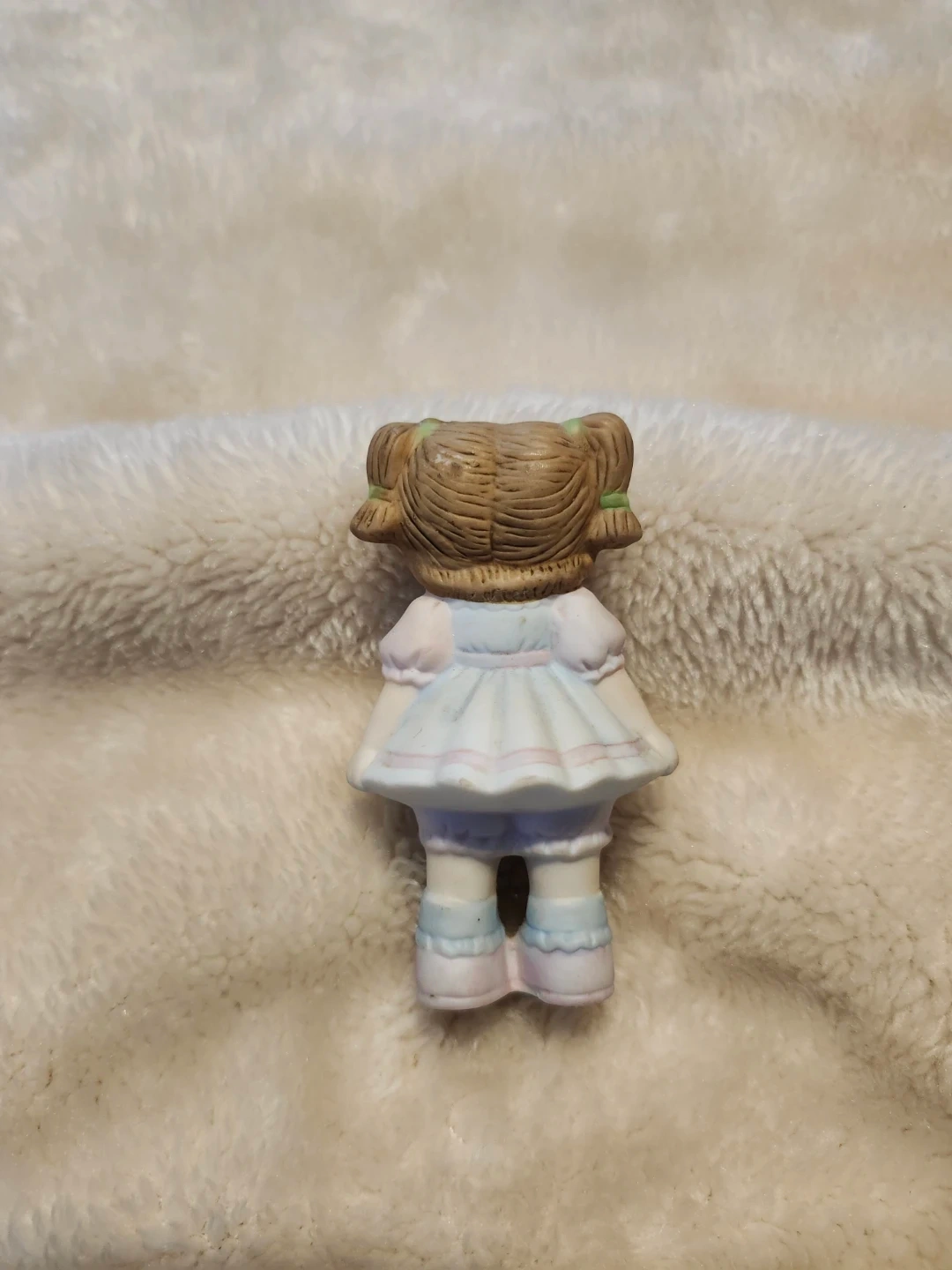 This is a Cabbage Patch Kids porcelain figurine is in excellent condition. It's from 1984 and made in Taiwan. The figurine is dressed in a blue and white dress with pink accents.
