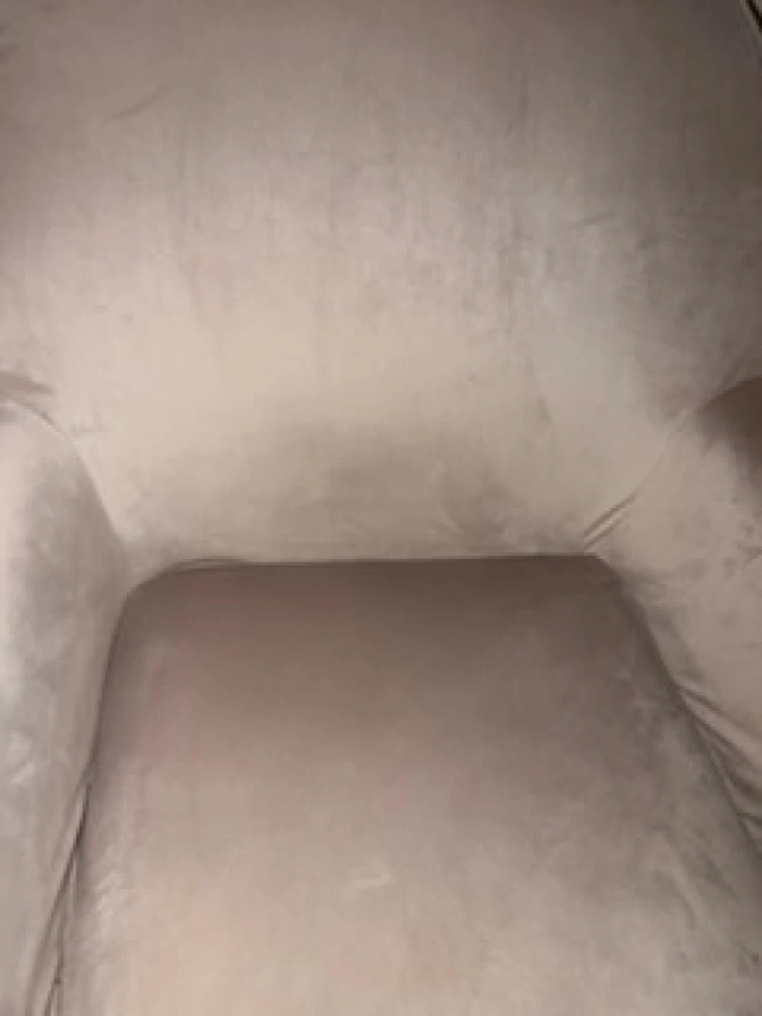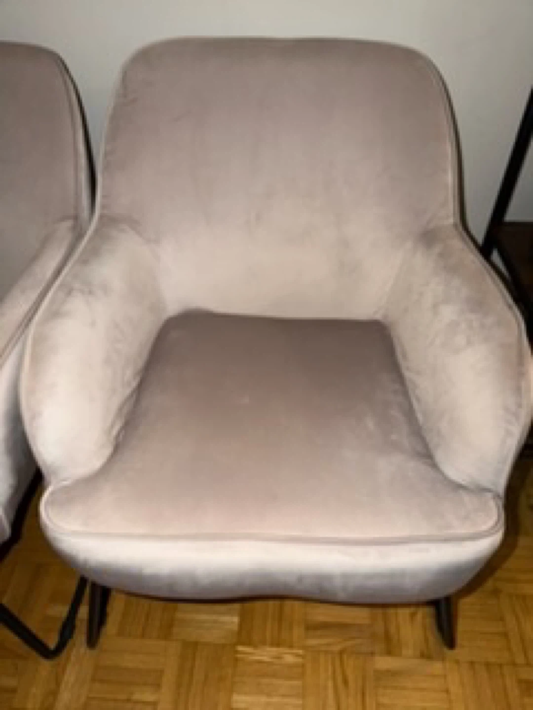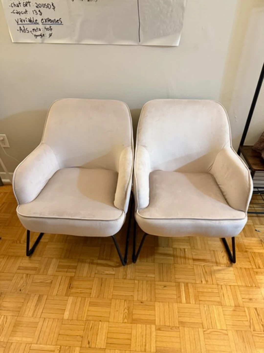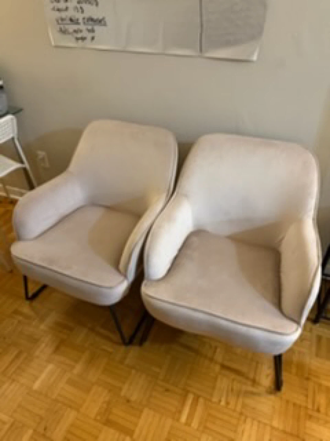 Selling a pair of stylish light beige accent chairs. They feature a soft upholstery and modern black metal legs. These chairs would be a nice addition to a living room or entryway.