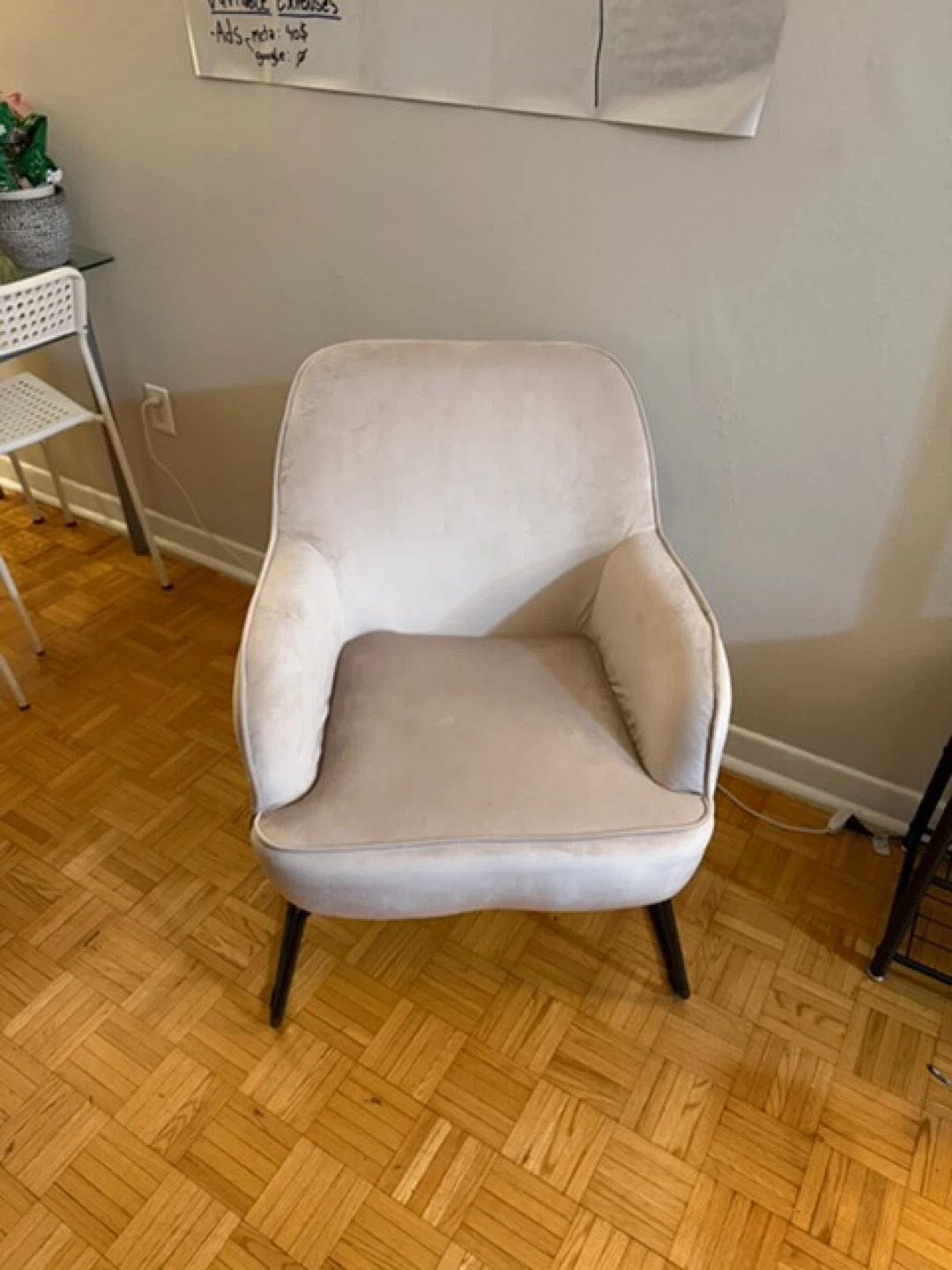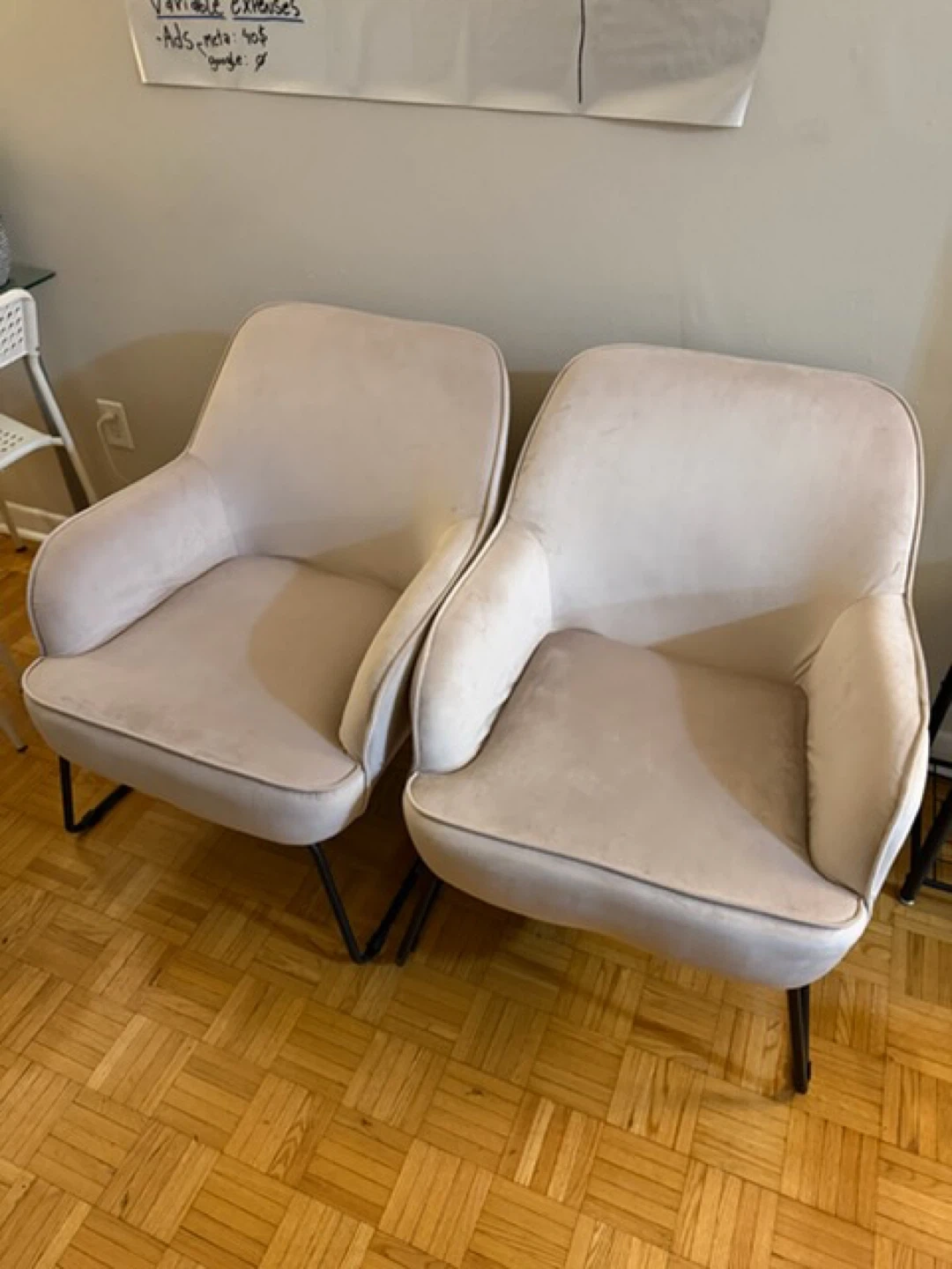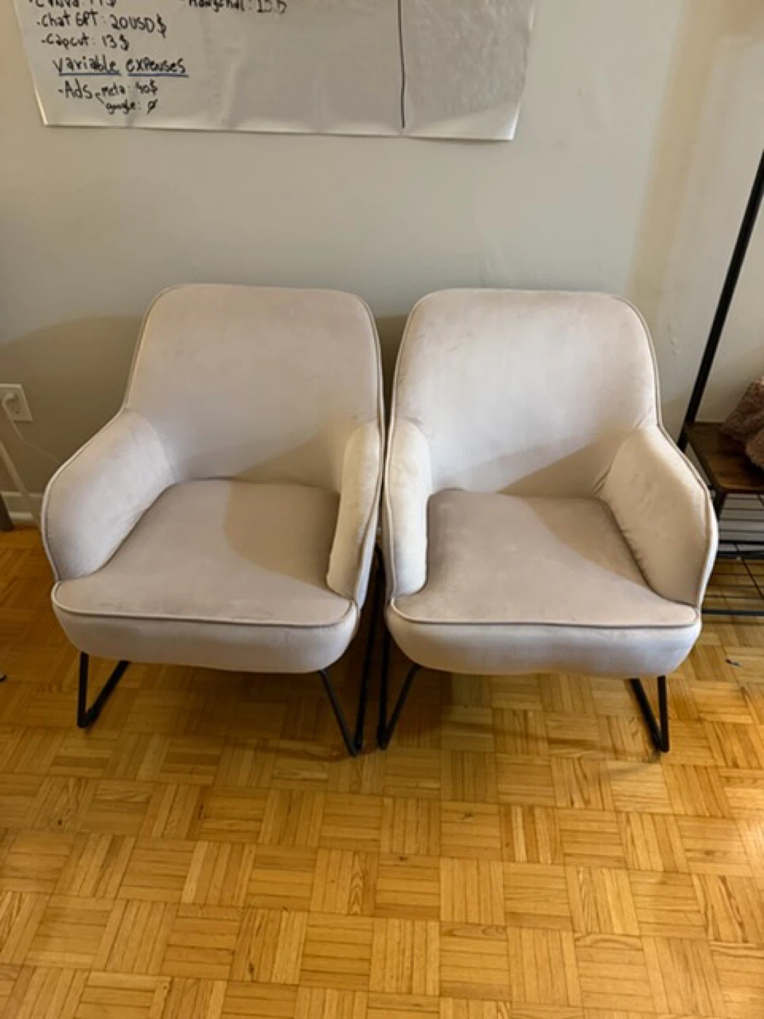 Selling a pair of stylish light beige accent chairs. They feature a soft upholstery and modern black metal legs. These chairs would be a nice addition to a living room or entryway.