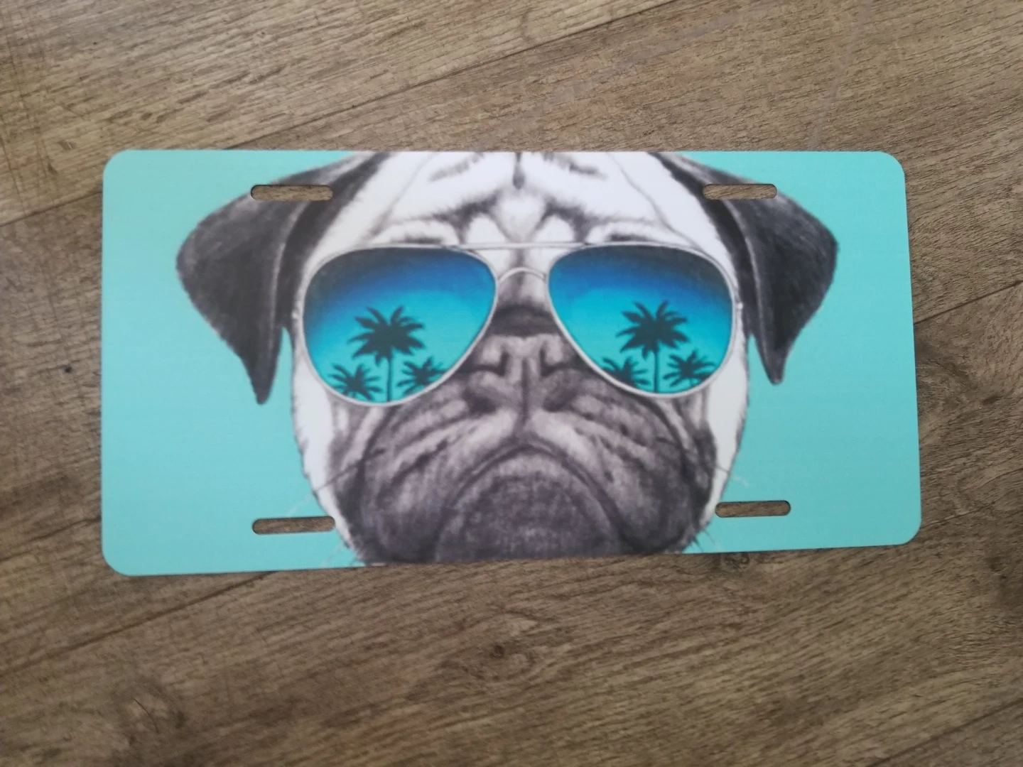 This novelty license plate features a fun graphic of a pug wearing aviator sunglasses with a palm tree reflection. Perfect for adding a touch of personality to a vehicle or for display!