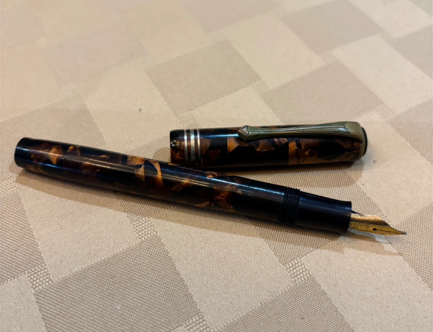 This is a vintage fountain pen (1950’s from Germany) with a classic tortoiseshell pattern. It features a gold-toned nib and trim. It's perfect for collectors or anyone who appreciates fine writing instruments.