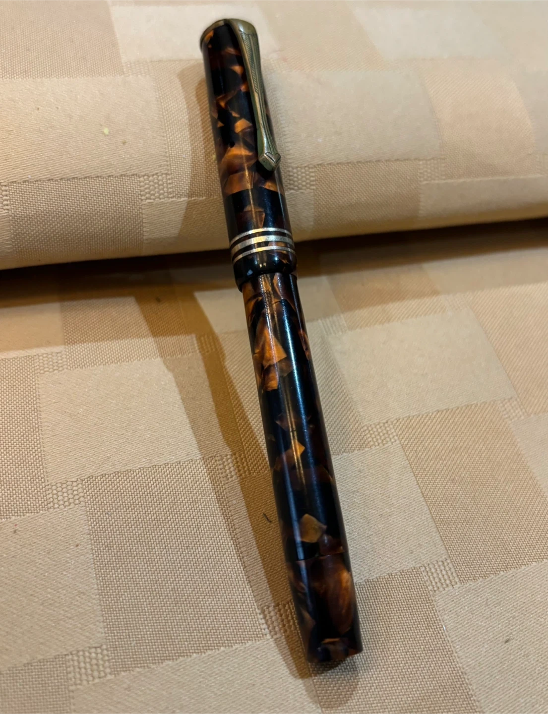 This is a vintage fountain pen (1950’s from Germany) with a classic tortoiseshell pattern. It features a gold-toned nib and trim. It's perfect for collectors or anyone who appreciates fine writing instruments.
